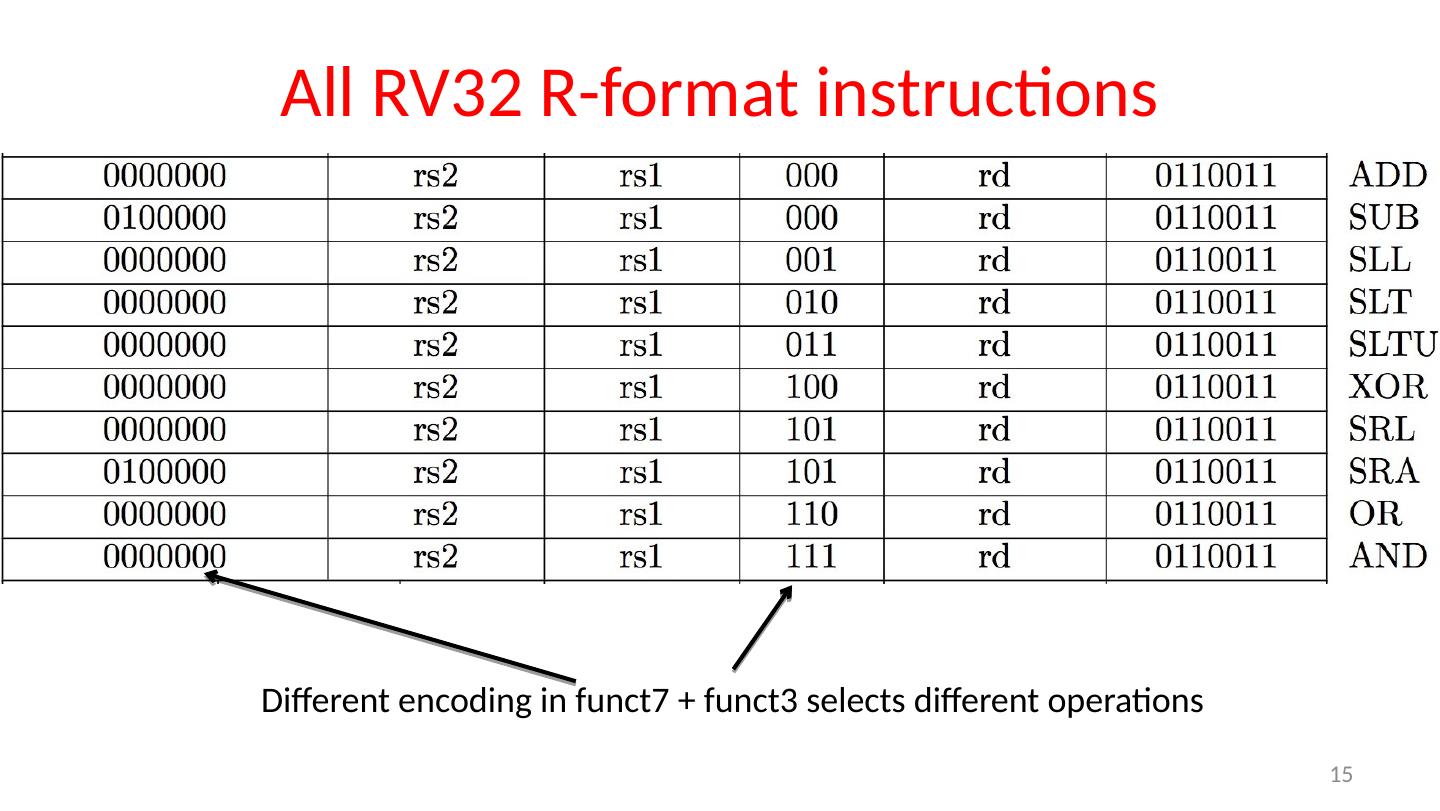 15 .All RV32 R-format instructions 15 Different encoding in funct7 + funct3 selects different operations