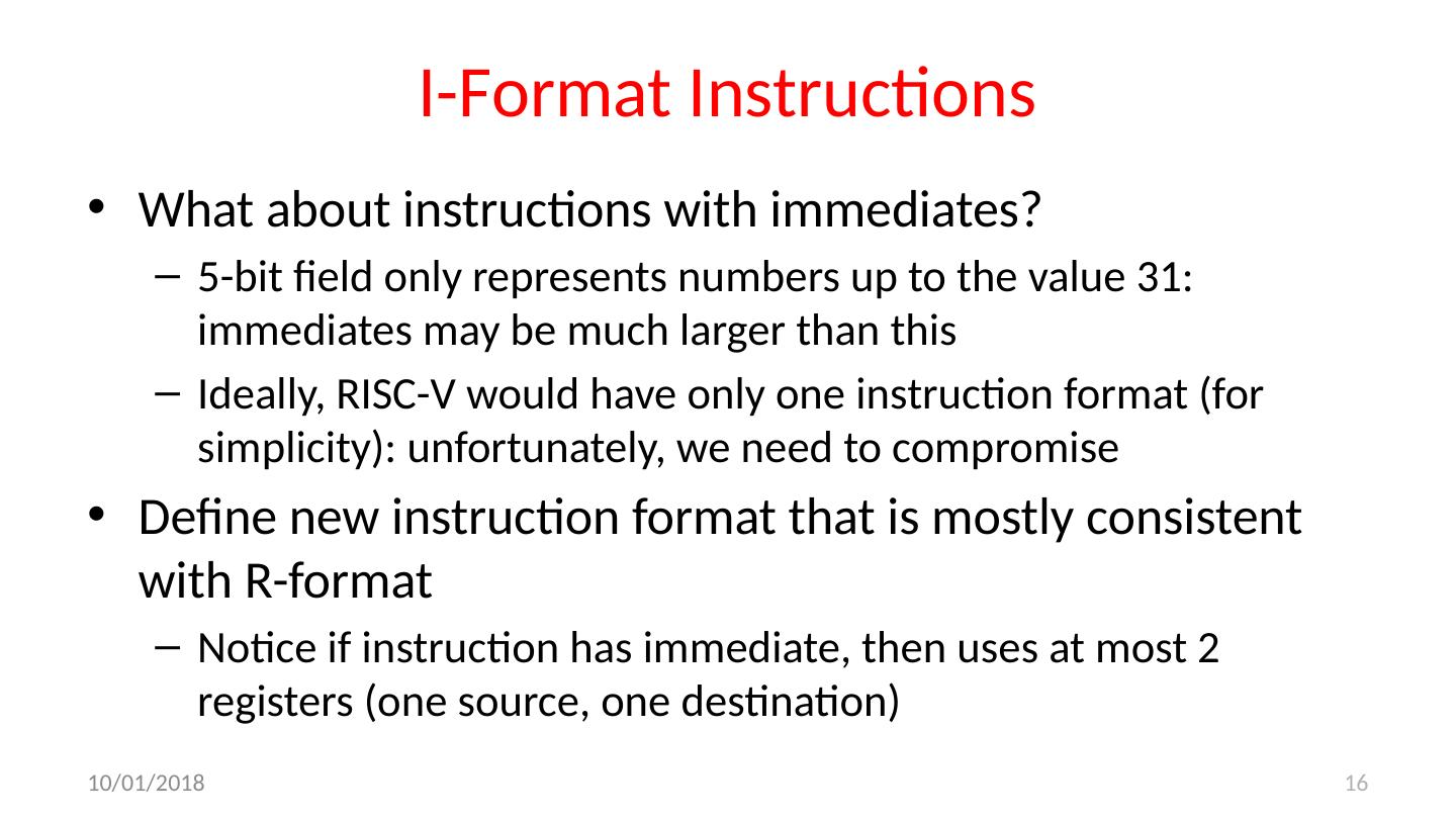 16 .I-Format Instructions What about instructions with immediates ? 5-bit field only represents numbers up to the value 31: immediates may be much larger than this Ideally, RISC-V would have only one instruction format (for simplicity): unfortunately, we need to compromise Define new instruction format that is mostly consistent with R-format Notice if instruction has immediate, then uses at most 2 registers (one source, one destination) 9/14/17 16