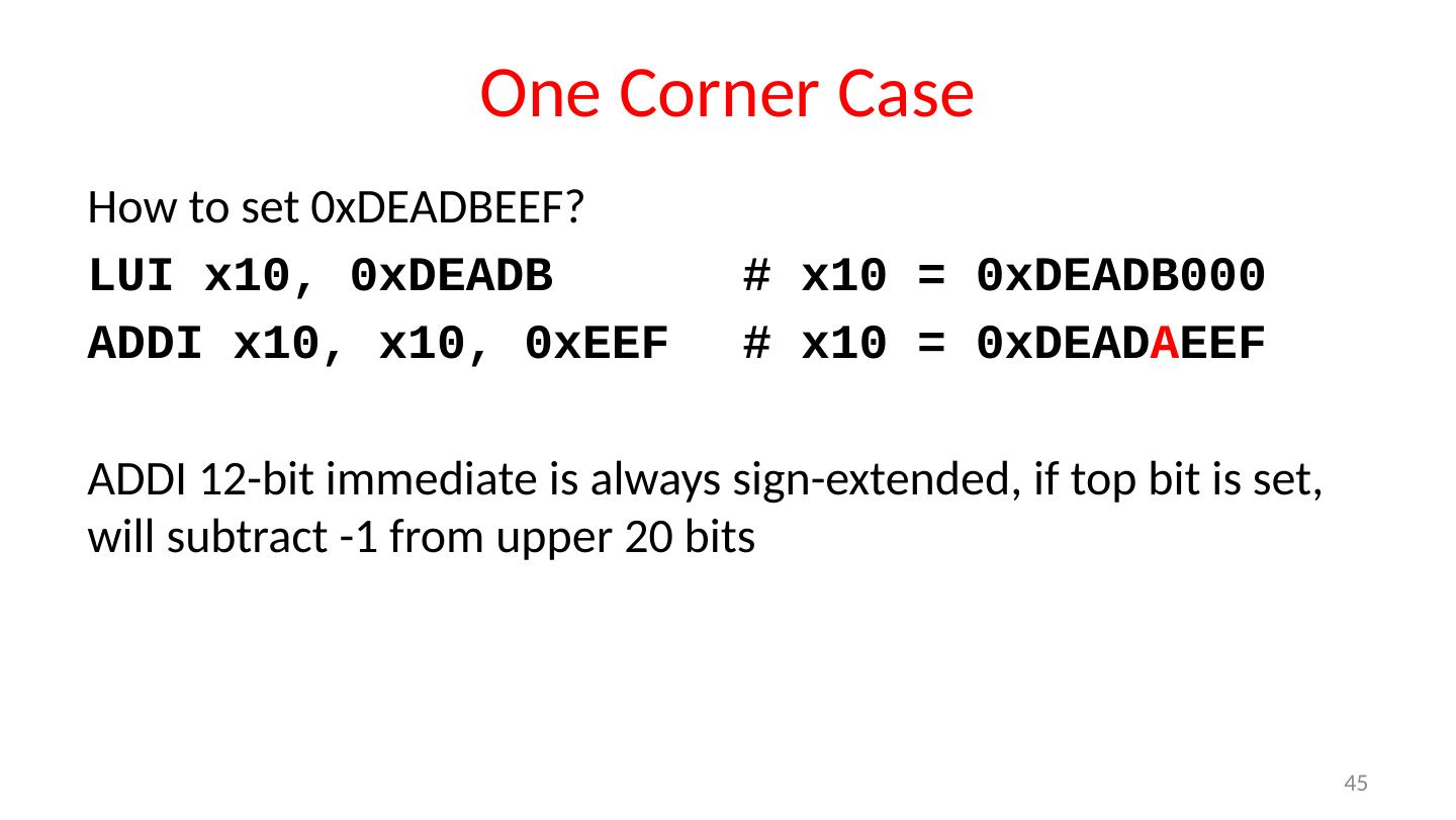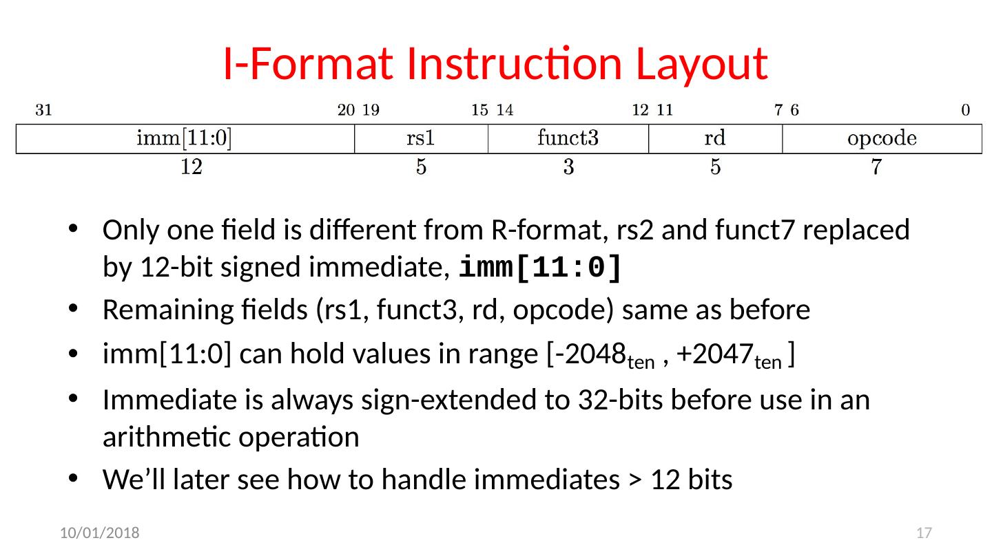 17 .I -Format Instruction Layout 17 9/14/17 Only one field is different from R- format, rs2 and funct7 replaced by 12-bit signed immediate, imm [11:0] Remaining fields (rs1, funct3, rd , opcode ) same as before i mm [11:0] can hold values in range [-2048 ten , +2047 ten ] Immediate is always sign-extended to 32-bits before use in an arithmetic operation W e’ll later see how to handle immediates > 12 bits