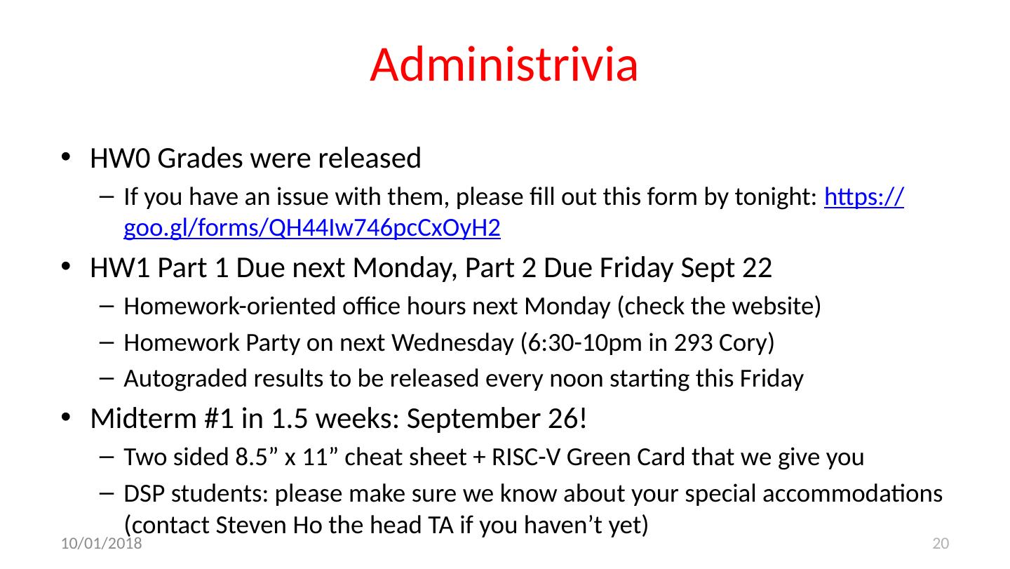 20 .Administrivia HW0 Grades were released If you have an issue with them, please fill out this form by tonight: https:// goo.gl/forms/QH44Iw746pcCxOyH2 HW1 Part 1 Due next Monday, Part 2 Due Friday Sept 22 Homework-oriented office hours next Monday (check the website) Homework Party on next Wednesday (6:30-10pm in 293 Cory) Autograded results to be released every noon starting this Friday Midterm #1 in 1.5 weeks: September 26! Two sided 8.5” x 11” cheat sheet + RISC-V Green Card that we give you DSP students: please make sure we know about your special accommodations (contact Steven Ho the head TA if you haven’t yet) 9/14/17 20
