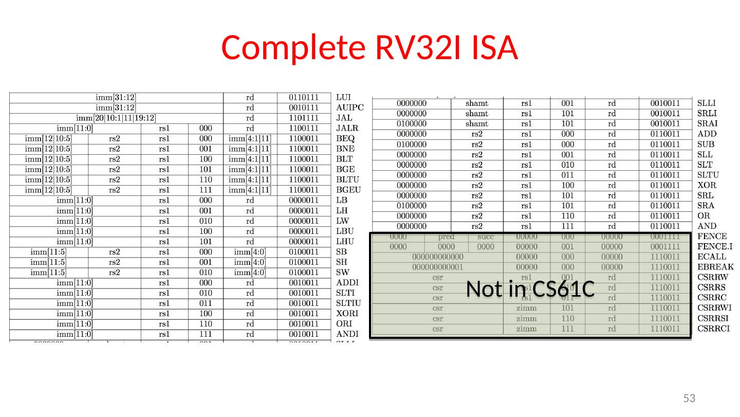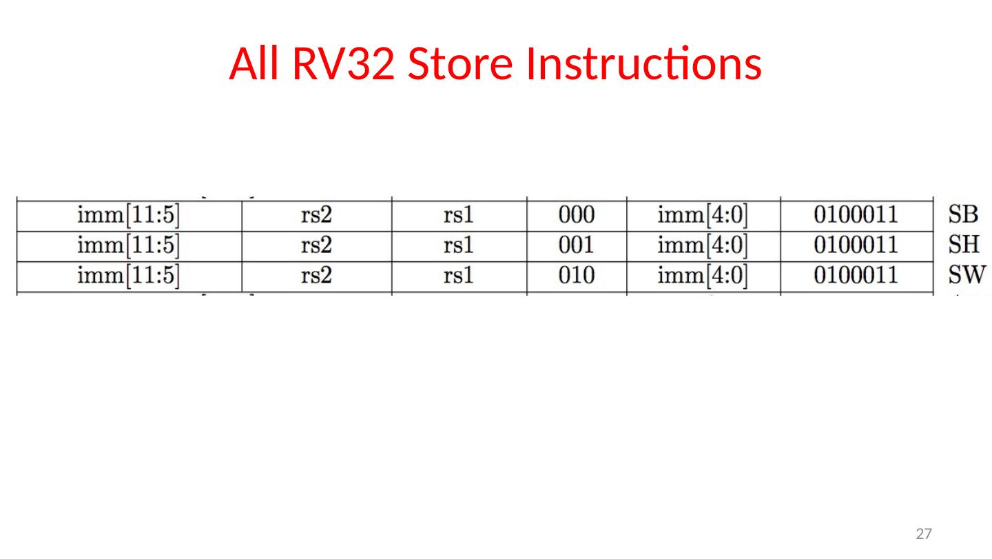 24 .All RV32 Load Instructions LBU is “load unsigned byte” LH is “load halfword ”, which loads 16 bits (2 bytes) and sign-extends to fill destination 32-bit register LHU is “load unsigned halfword ”, which zero-extends 16 bits to fill destination 32-bit register There is no LWU in RV32, because there is no sign/zero extension needed when copying 32 bits from a memory location into a 32-bit register 24 funct3 field encodes size and signedness of load data