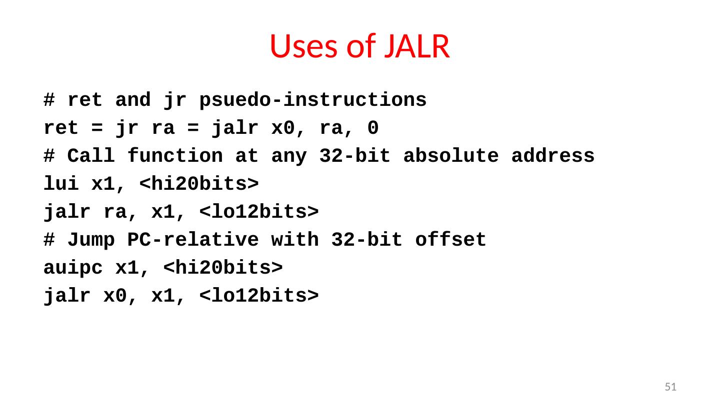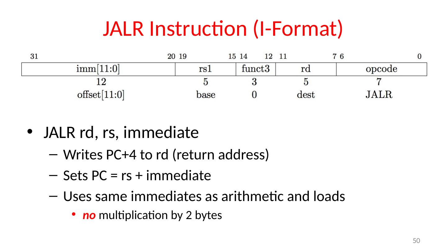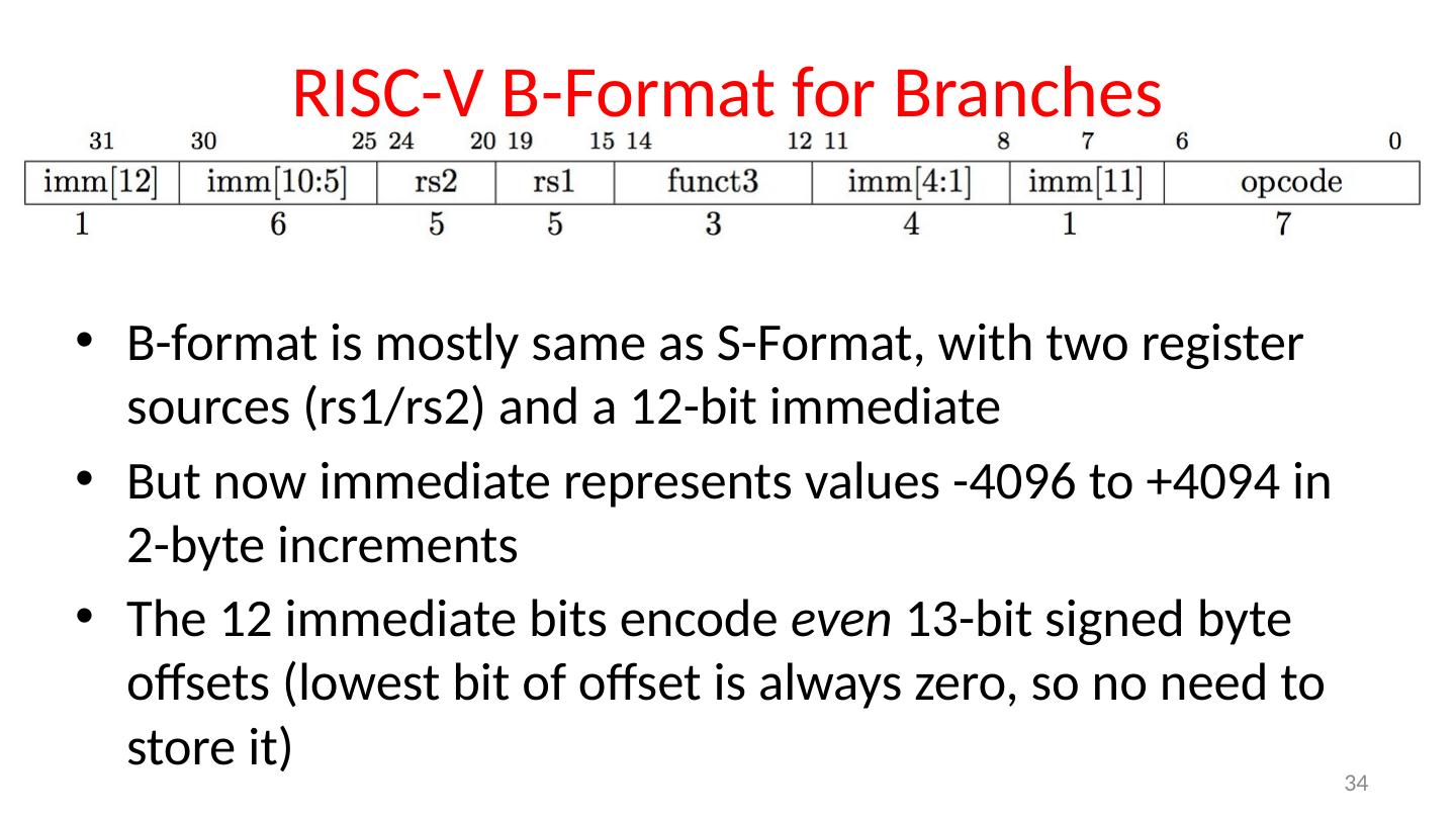 25 .S -Format Used for Stores 25 9/14/17 Store needs to read two registers, rs1 for base memory address, and rs2 for data to be stored, as well as need immediate offset! Can’t have both rs2 and immediate in same place as other instructions! Note that stores don’t write a value to the register file, no rd ! RISC-V design decision is move low 5 bits of immediate to where rd field was in other instructions – keep rs1/rs2 fields in same place register names more critical than immediate bits in hardware design