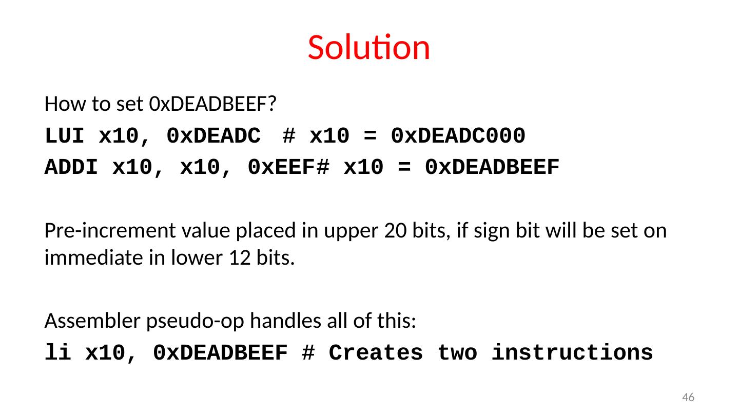 19 .All RV32 I-format Arithmetic Instructions 19 “Shift-by-immediate” instructions only use lower 5 bits of the immediate value for shift amount (can only shift by 0-31 bit positions) One of the higher-order immediate bits is used to distinguish “shift right logical” (SRLI) from “shift right arithmetic” (SRAI)