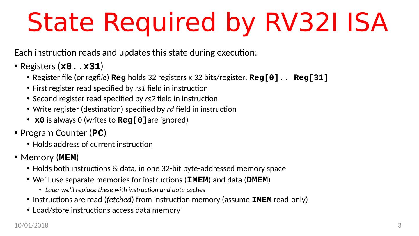 3 .State Required by RV32I ISA Each instruction reads and updates this state during execution: Registers ( x0.. x31 ) Register file (or regfile ) Reg holds 32 registers x 32 bits/ register: Reg [0].. Reg [31] First register read specified by rs1 field in instruction Second register read specified by rs2 field in instruction Write register (destination) specified by rd field in instruction x0 is always 0 (writes to Reg [ 0] are ignored) Program Counter ( PC ) Holds address of current instruction Memory ( MEM ) Holds both instructions & data, in one 32-bit byte-addressed memory space We’ll use separate memories for instructions ( IMEM ) and data ( DMEM ) Later we’ll replace these with instruction and data caches Instructions are read ( fetched ) from instruction memory (assume IMEM read-only) Load/store instructions access data memory 10/3/17 3