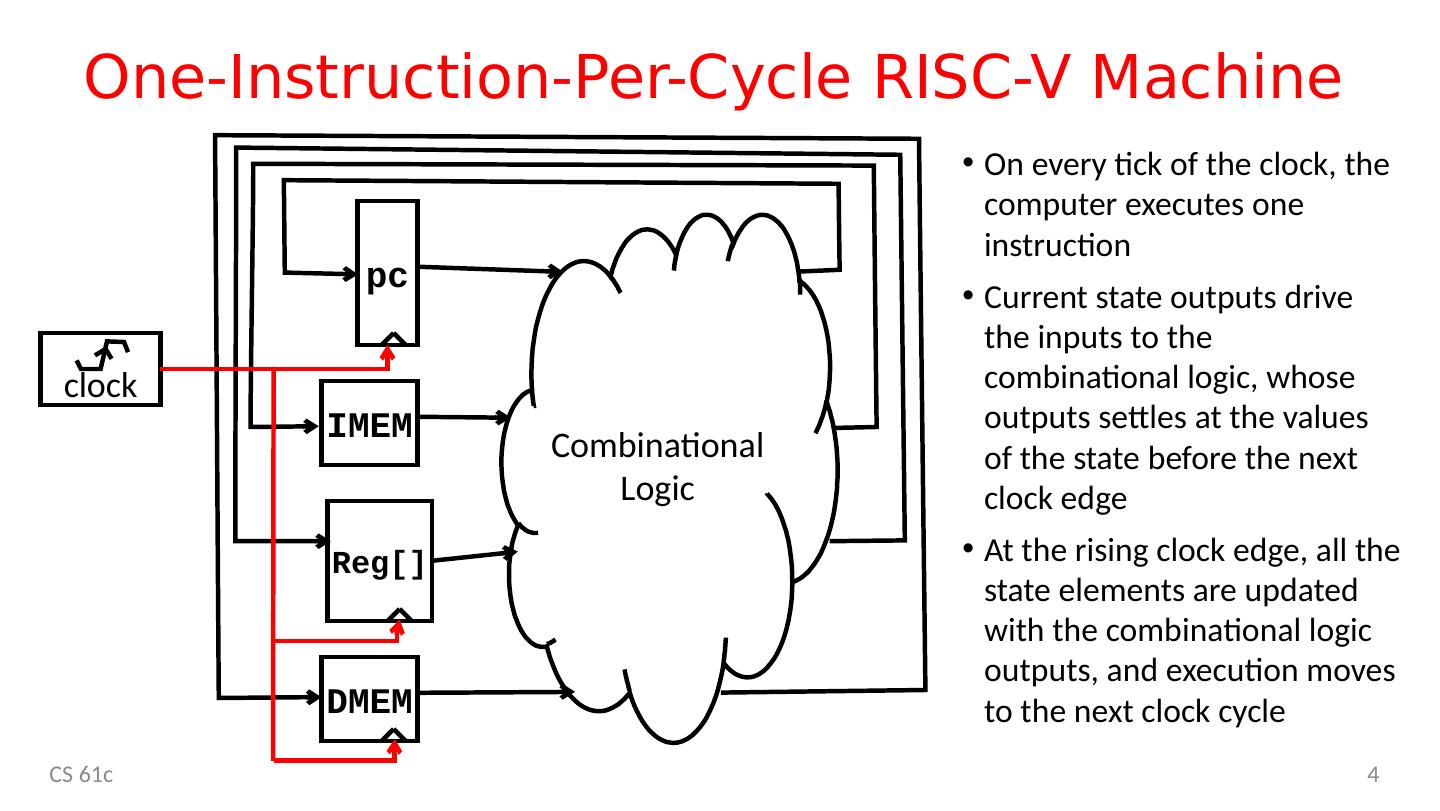4 .One-Instruction-Per-Cycle RISC-V Machine On every tick of the clock, the computer executes one instruction C urrent state outputs drive the inputs to the combinational logic, whose outputs settles at the values of the state before the next clock edge At the rising clock edge, all the state elements are updated with the combinational logic outputs, and execution moves to the next clock cycle CS 61c 4 Reg [] pc IMEM D MEM Combinational Logic clock