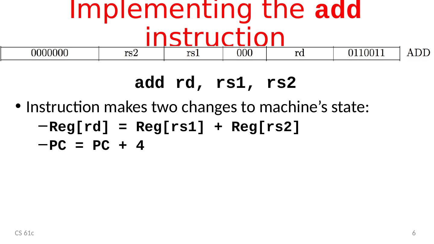 6 .Implementing the add instruction add rd , rs1, rs2 Instruction makes two changes to machine’s state: Reg [ rd ] = Reg [rs1] + Reg [rs2] PC = PC + 4 CS 61c 6