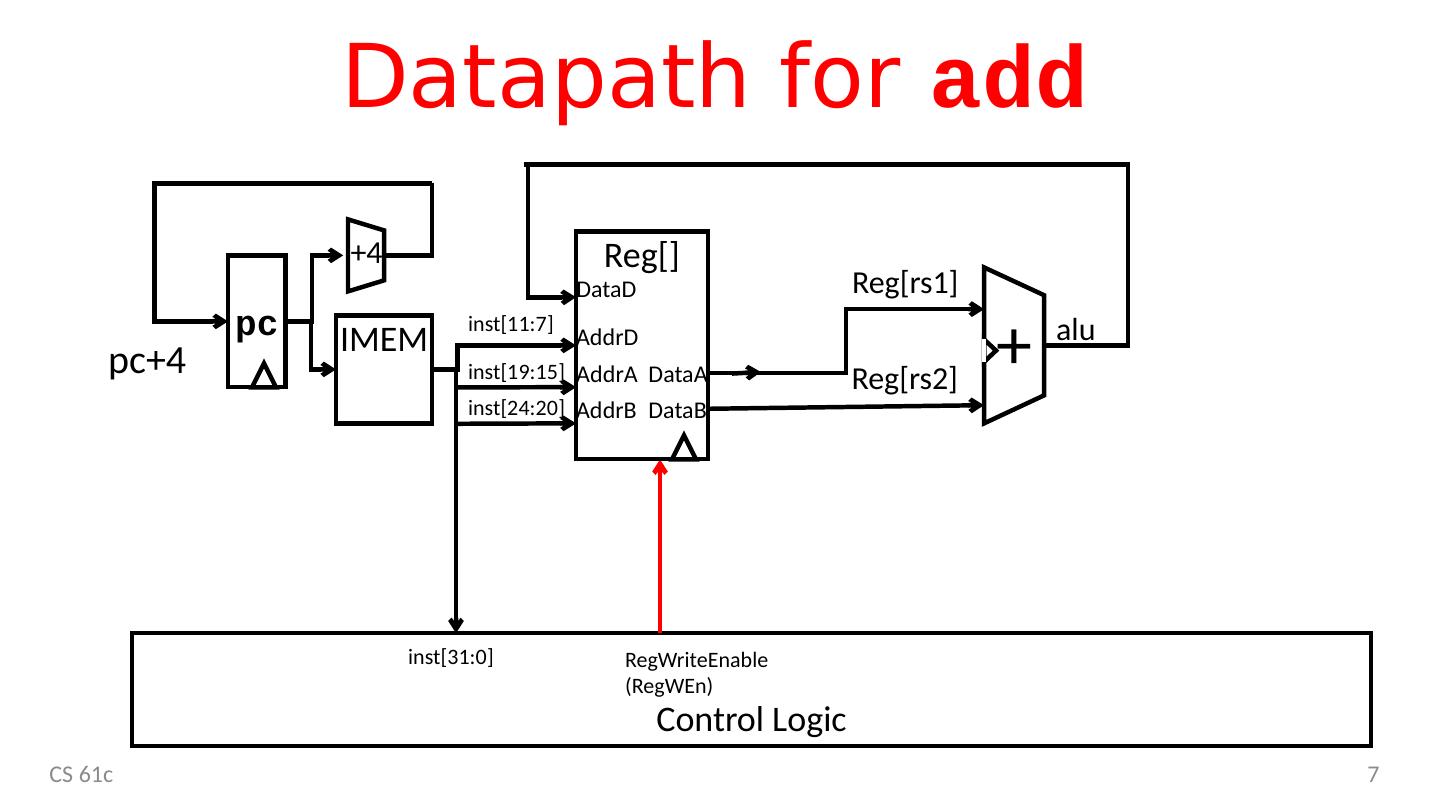 7 .Control Logic Datapath for add CS 61c 7 +4 pc pc+4 inst [11:7] inst [19:15] inst [24:20] IMEM inst [31:0] RegWriteEnable ( RegWEn ) Reg [] AddrA AddrB DataA AddrD DataB DataD Reg [rs1] Reg [rs2] + alu
