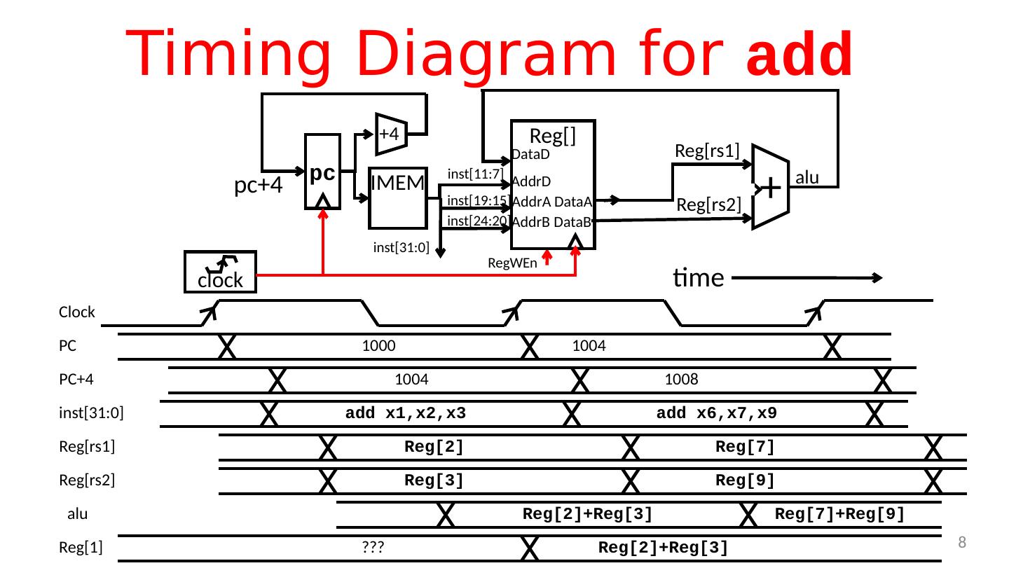 8 .Timing Diagram for add 8 1000 1004 PC 1004 1008 PC+4 add x1,x2,x3 add x6 ,x7,x9 inst [31:0] Clock time +4 pc pc+4 inst [11:7] inst [19:15] inst [24:20] IMEM inst [31:0] + RegWEn Reg [] AddrA AddrB DataA AddrD DataB DataD Reg [rs1] Reg [rs2] clock alu Reg [2] Reg [7] Reg [rs1] Reg [2]+ Reg [3] alu Reg [7]+ Reg [9] Reg [3] Reg [9] Reg [rs2] ??? Reg [1] Reg [2]+ Reg [3]