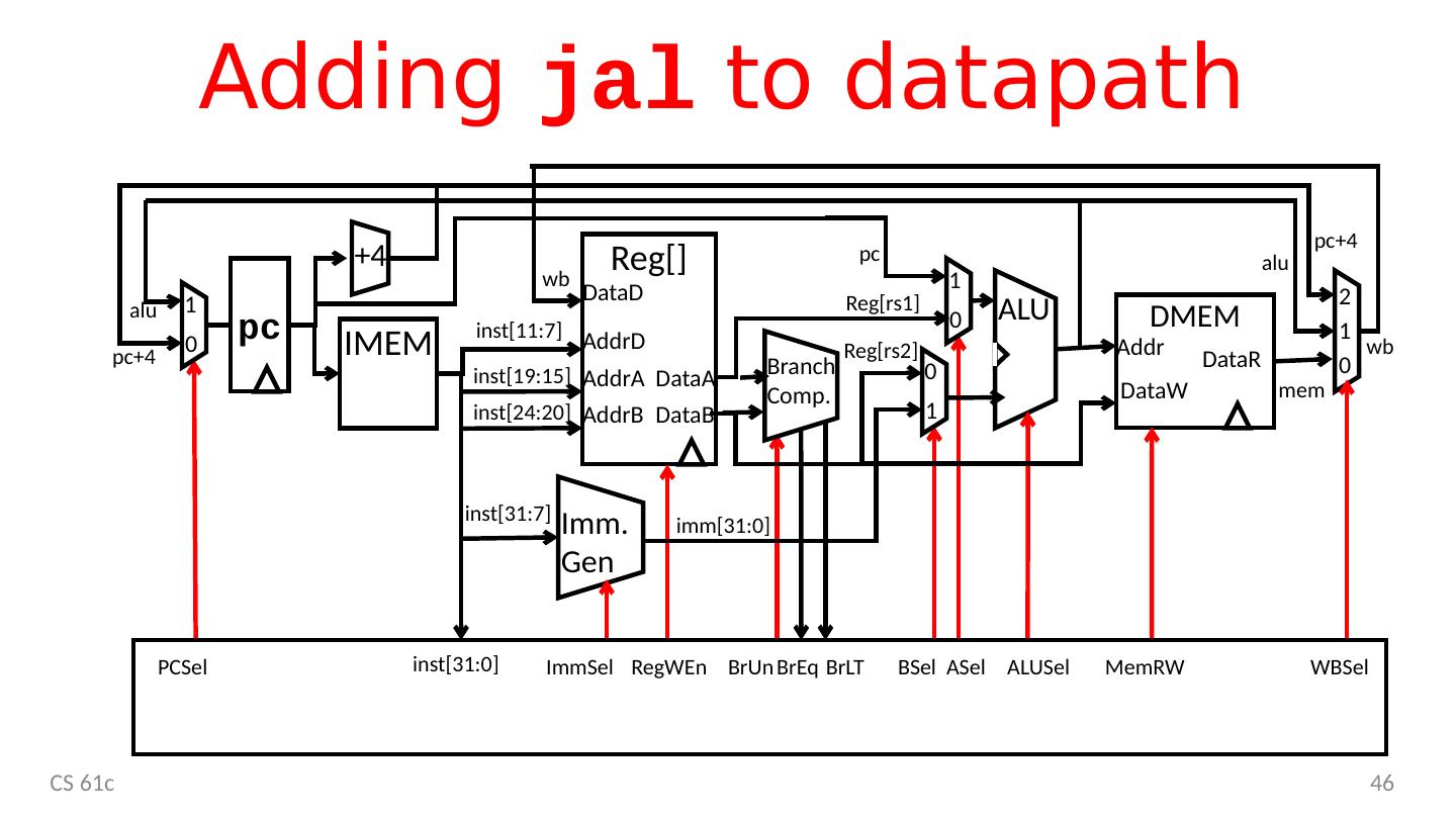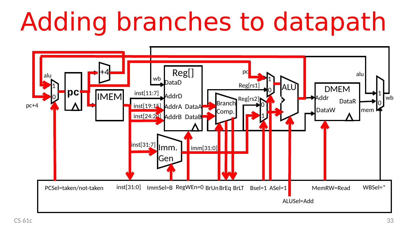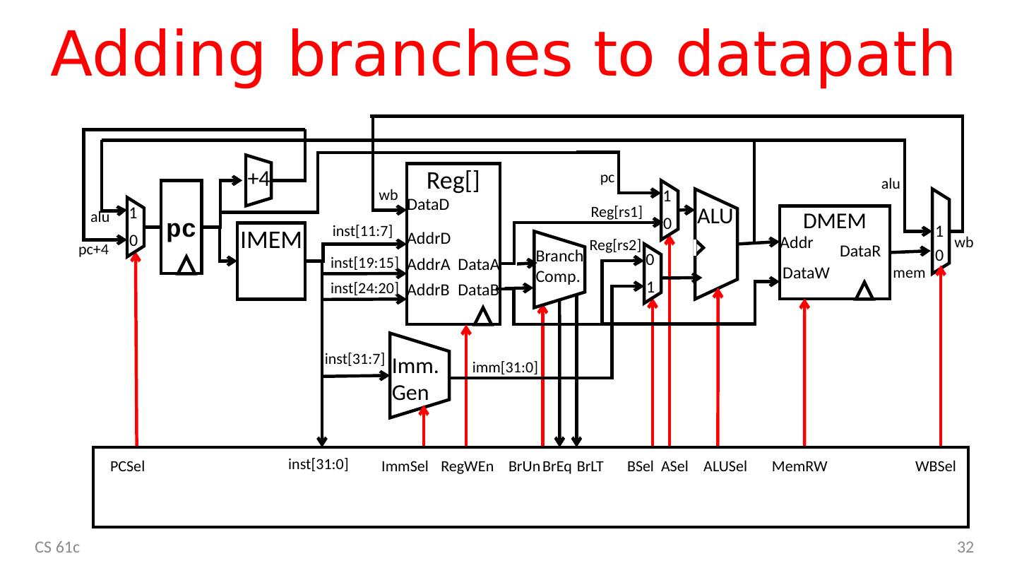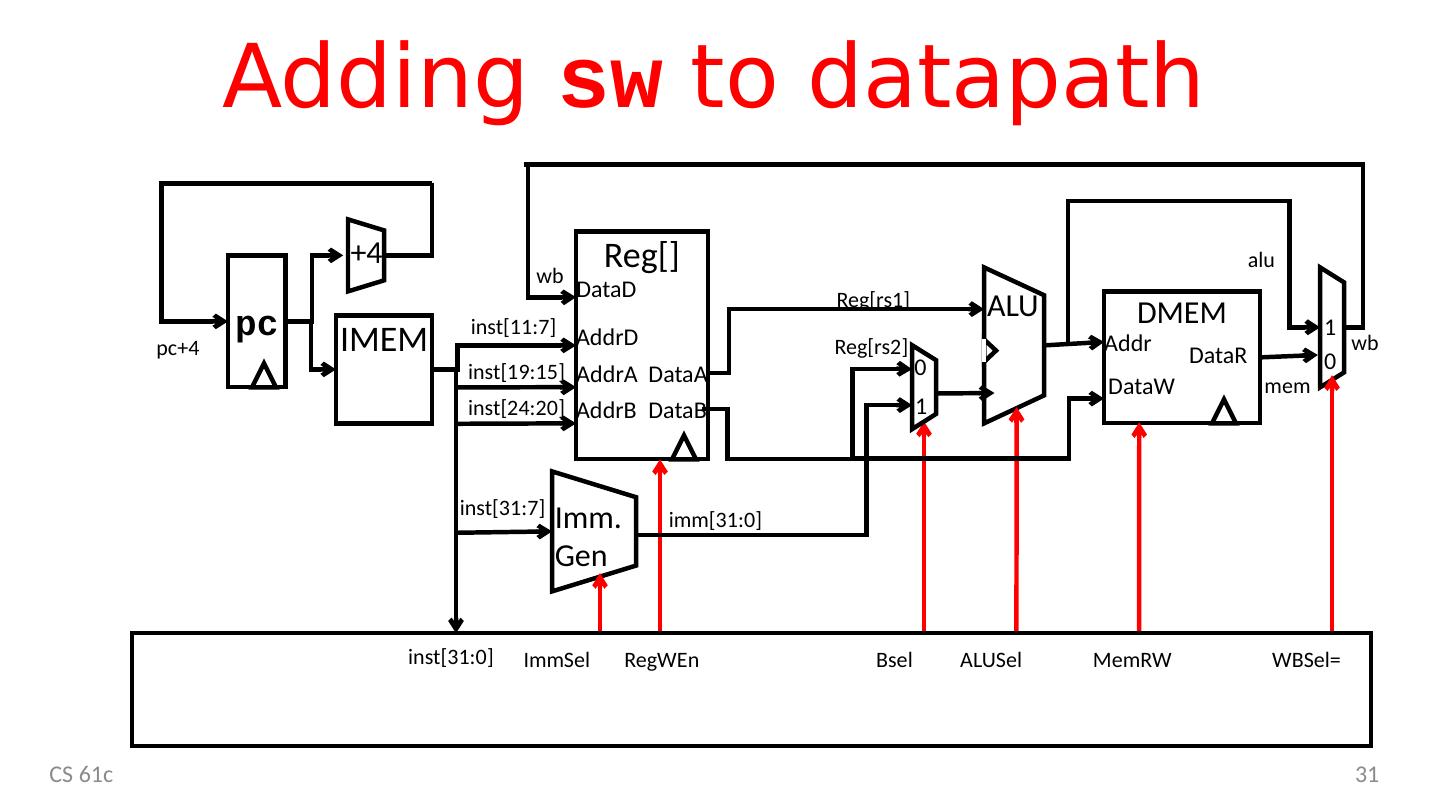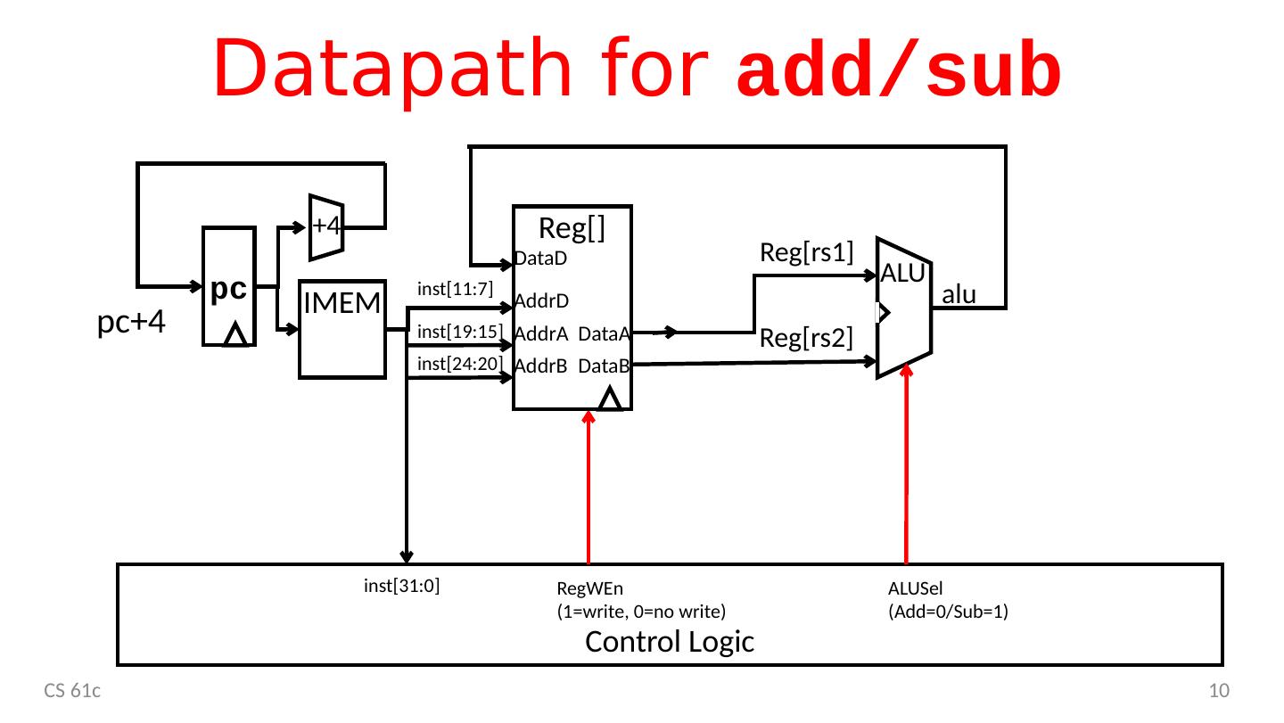 10 .Control Logic D atapath for add/sub CS 61c 10 +4 pc pc+4 inst [11:7] inst [19:15] inst [24:20] IMEM inst [31:0] RegWEn (1=write, 0=no write) Reg [] AddrA AddrB DataA AddrD DataB DataD Reg [rs1] Reg [rs2] alu ALU ALUSel (Add=0/Sub=1)