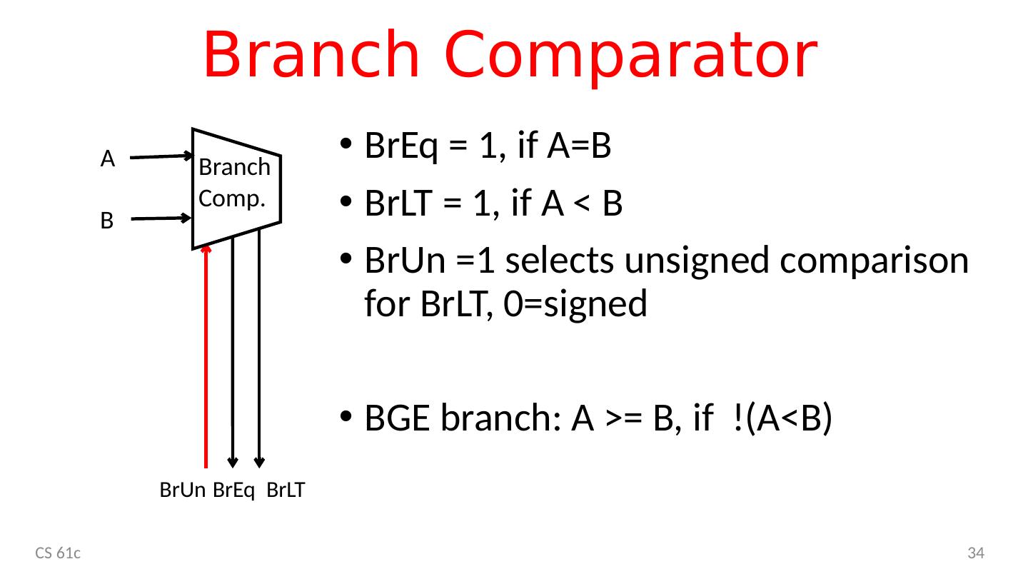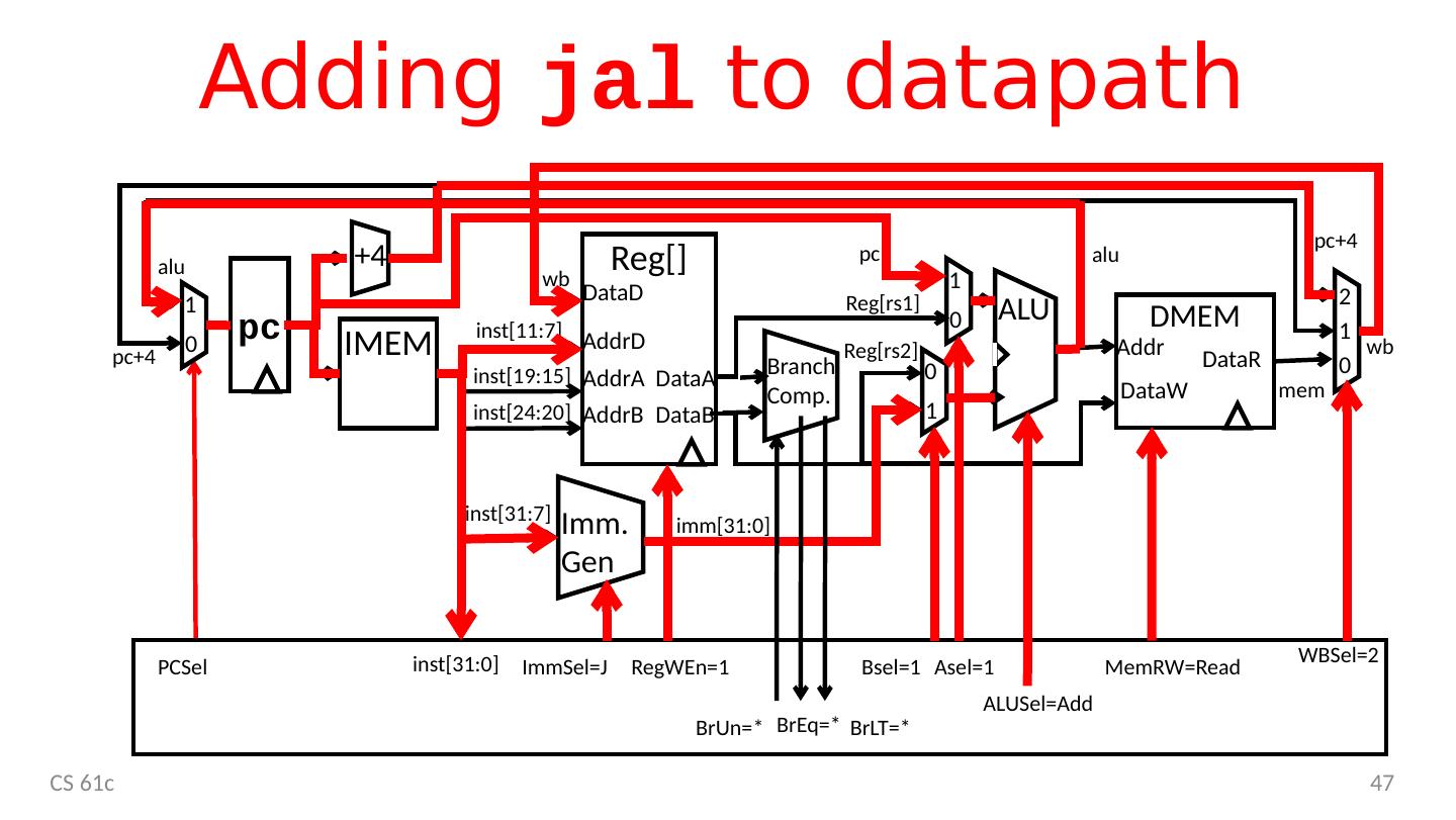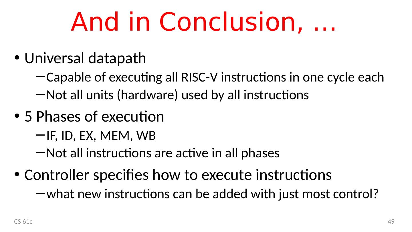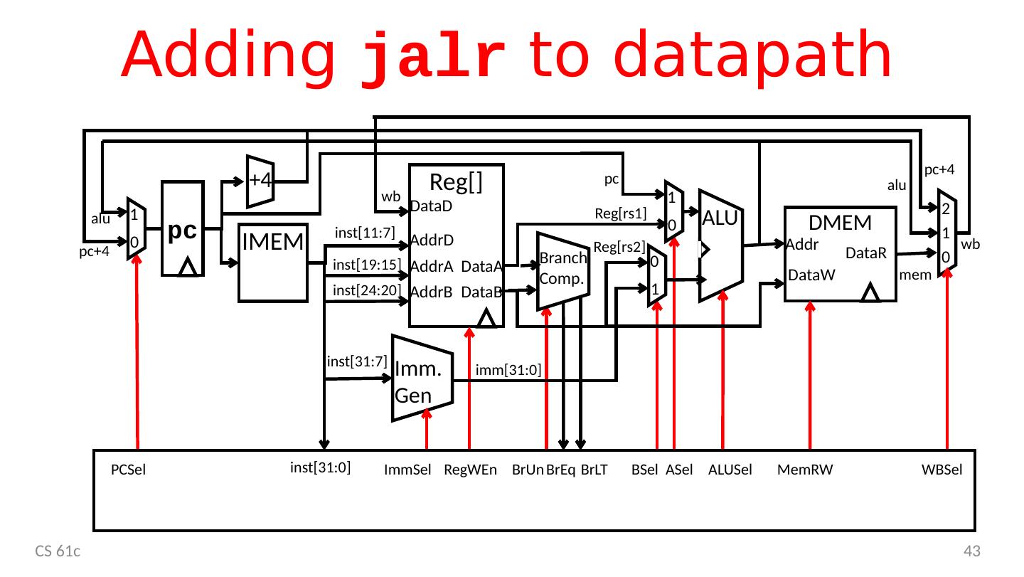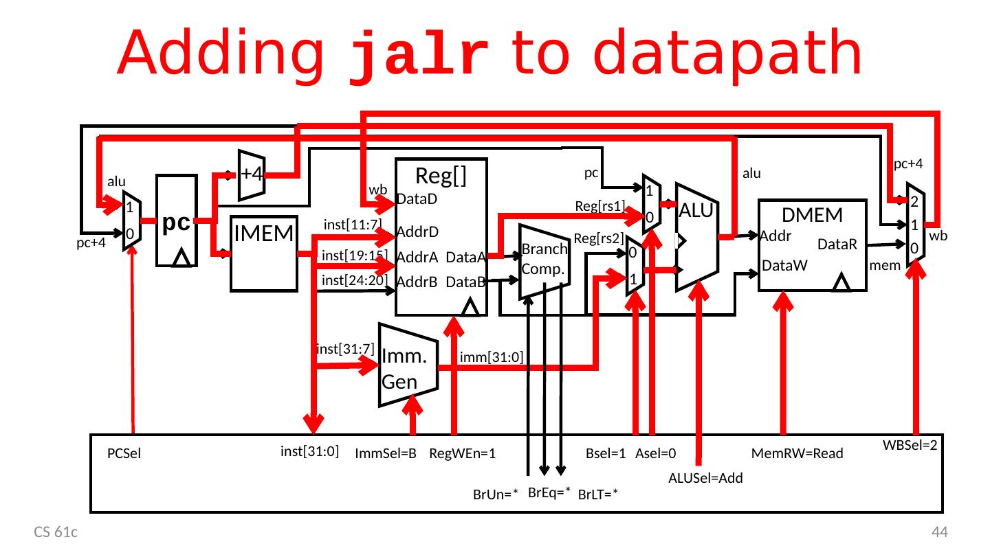 10 .Control Logic D atapath for add/sub CS 61c 10 +4 pc pc+4 inst [11:7] inst [19:15] inst [24:20] IMEM inst [31:0] RegWEn (1=write, 0=no write) Reg [] AddrA AddrB DataA AddrD DataB DataD Reg [rs1] Reg [rs2] alu ALU ALUSel (Add=0/Sub=1)