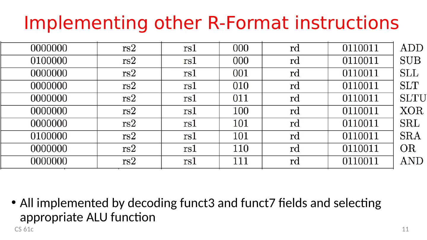 11 .Implementing other R-Format instructions All implemented by decoding funct3 and funct7 fields and selecting appropriate A LU function CS 61c 11