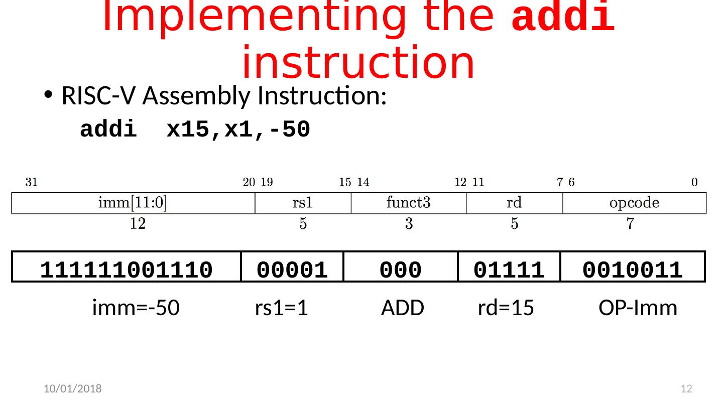 12 .Implementing the addi instruction RISC-V Assembly Instruction: addi x15,x1,-50 12 10/3/17 111111001110 00001 000 01111 0010011 OP- Imm r d =15 ADD i mm =-50 rs1=1