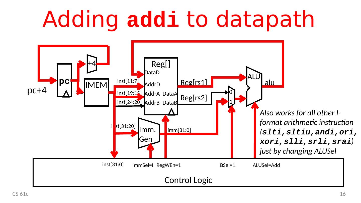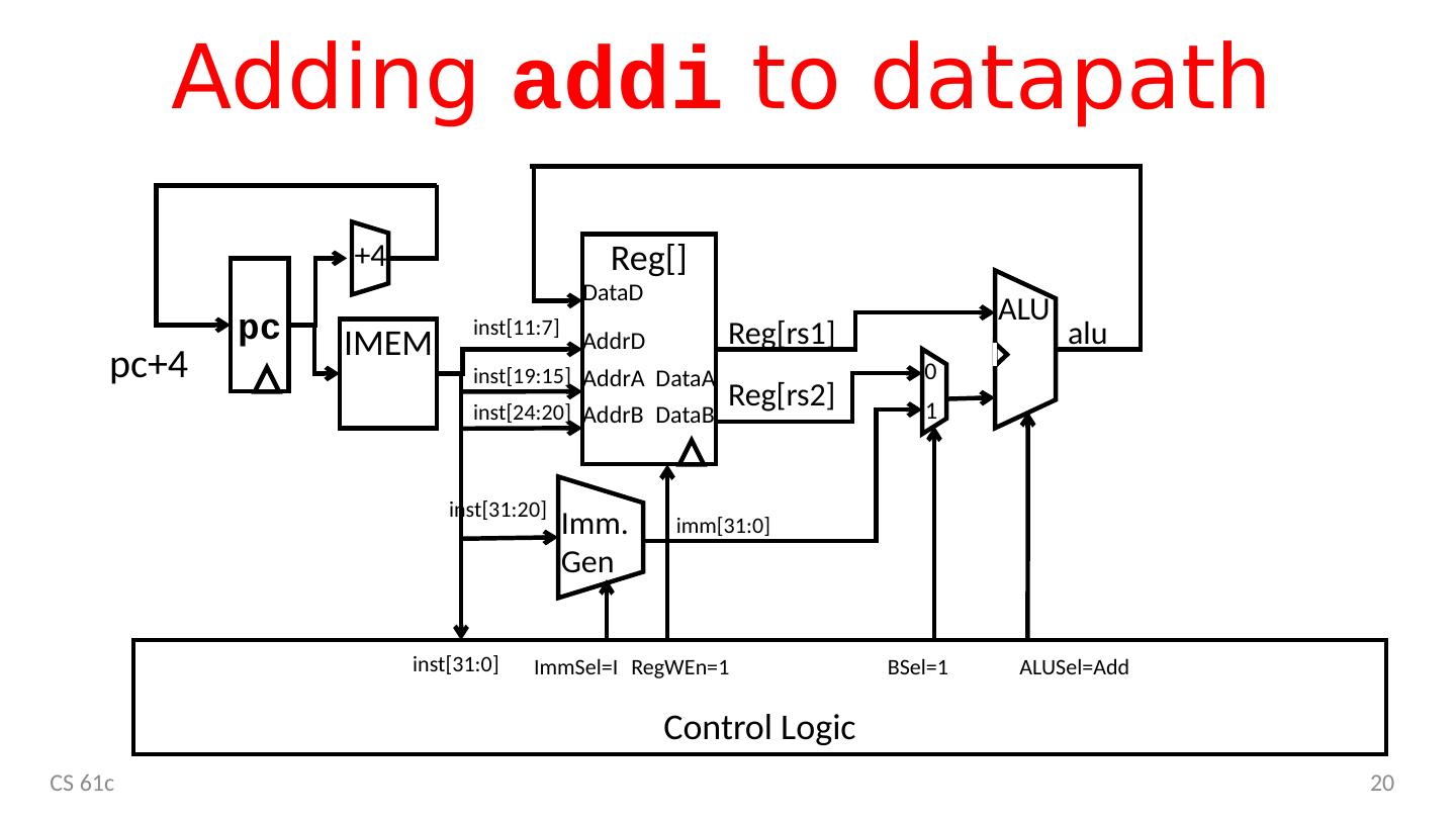 14 .Control Logic Adding addi to datapath CS 61c 14 +4 pc pc+4 inst [11:7] inst [19:15] inst [24:20] IMEM inst [31:0] Reg [] AddrA AddrB DataA AddrD DataB DataD Reg [rs1] Reg [rs2] alu ALU ALUSel =Add Imm . Gen 0 1 RegWEn =1 inst [31:20] imm [31:0] ImmSel =I BSel =1