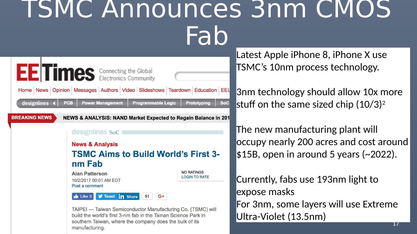 17 .TSMC Announces 3nm CMOS Fab CS 61c 17 Latest Apple iPhone 8, iPhone X use TSMC’s 10nm process technology. 3nm technology should allow 10x more stuff on the same sized chip (10/3) 2 The new manufacturing plant will occupy nearly 200 acres and cost around $15B, open in around 5 years (~2022). Currently, fabs use 193nm light to expose masks For 3nm, some layers will use Extreme Ultra-Violet (13.5nm)