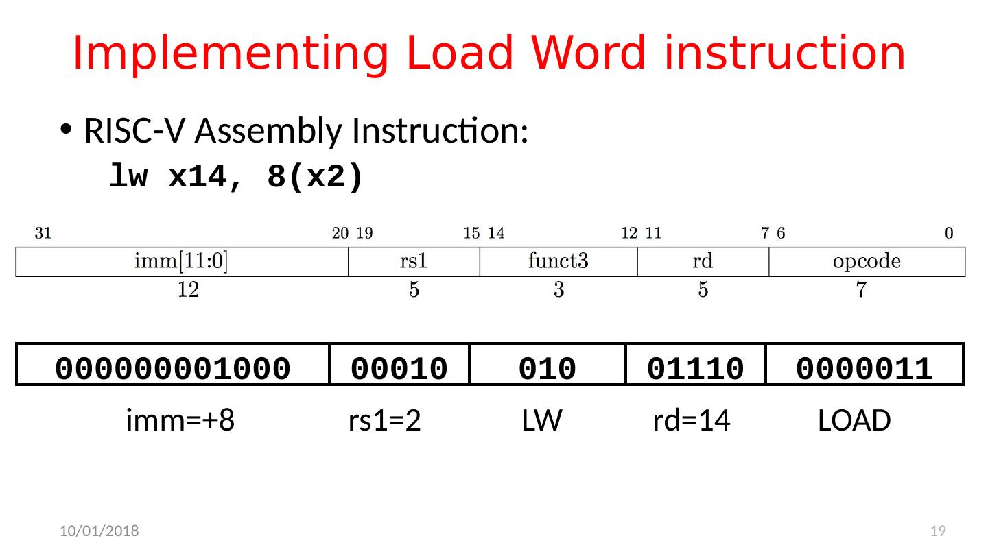 19 .Implementing Load Word instruction RISC-V Assembly Instruction: lw x14, 8(x2) 19 10/3/17 000000001000 00010 010 01110 0000011 LOAD r d =14 LW i mm =+8 rs1=2