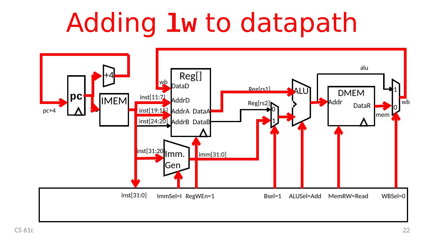 22 .Adding lw to datapath CS 61c 22 IMEM ALU Imm . Gen +4 D MEM Reg [] AddrA AddrB DataA AddrD DataB DataD Addr DataR 0 1 pc 0 1 inst [11:7] inst [19:15] inst [24:20] inst [31:20] alu mem wb pc+4 Reg [rs1] imm [31:0] Reg [rs2] inst [31:0] ImmSel =I RegWEn =1 Bsel =1 ALUSel =Add MemRW =Read WBSel =0 wb