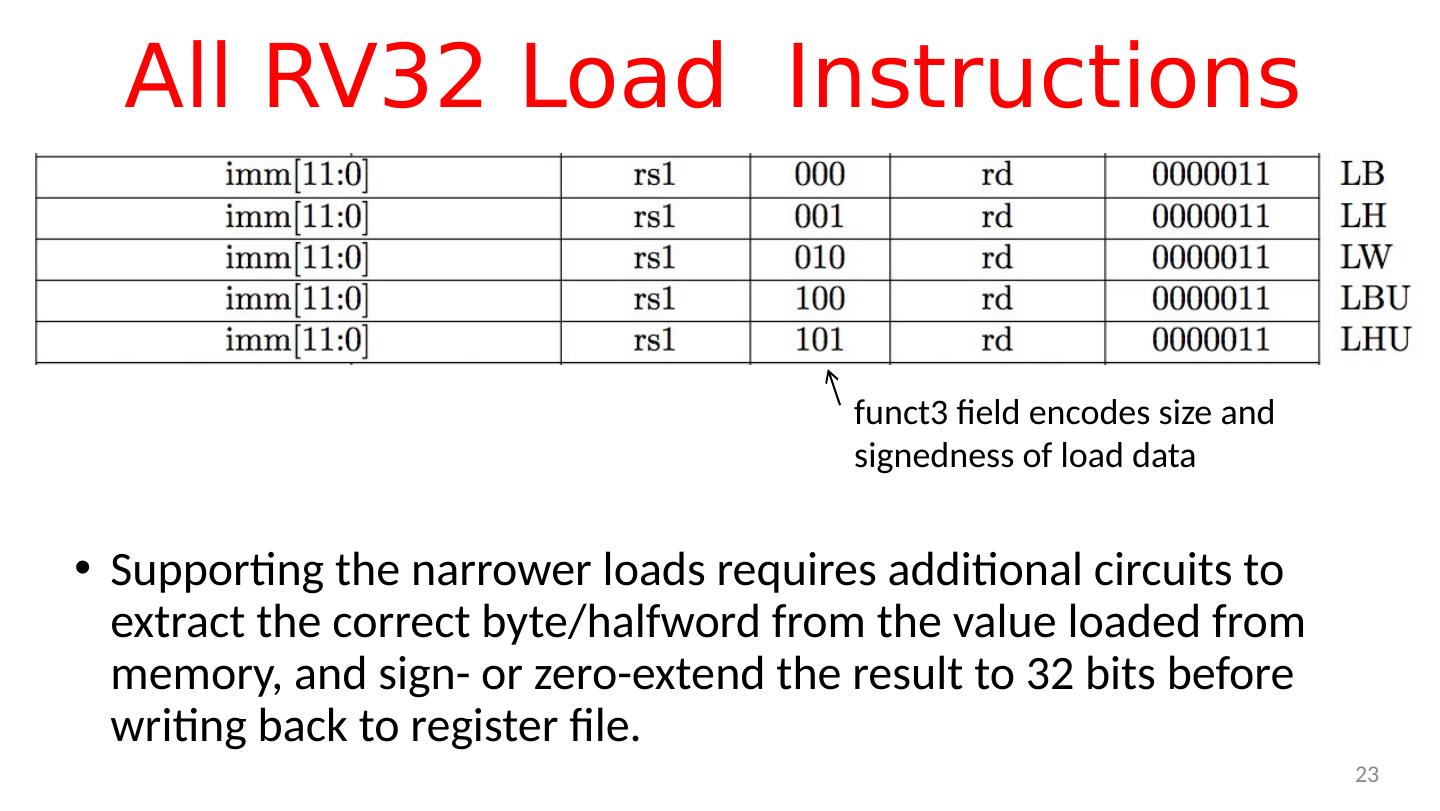 23 .All RV32 Load Instructions Supporting the narrower loads requires additional circuits to extract the correct byte/ halfword from the value loaded from memory, and sign- or zero-extend the result to 32 bits before writing back to register file. 23 funct3 field encodes size and signedness of load data