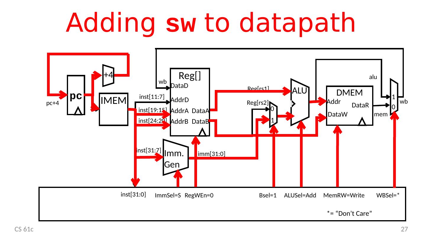 27 .Adding s w to datapath CS 61c 27 IMEM ALU Imm . Gen +4 D MEM Reg [] AddrA AddrB DataA AddrD DataB DataD Addr DataW DataR 0 1 pc 0 1 inst [11:7] inst [19:15] inst [24:20] inst [31:7] alu mem wb pc+4 Reg [rs1] imm [31:0] Reg [rs2] inst [31:0] ImmSel =S RegWEn =0 Bsel =1 ALUSel =Add MemRW =Write WBSel =* wb *= “Don’t Care”