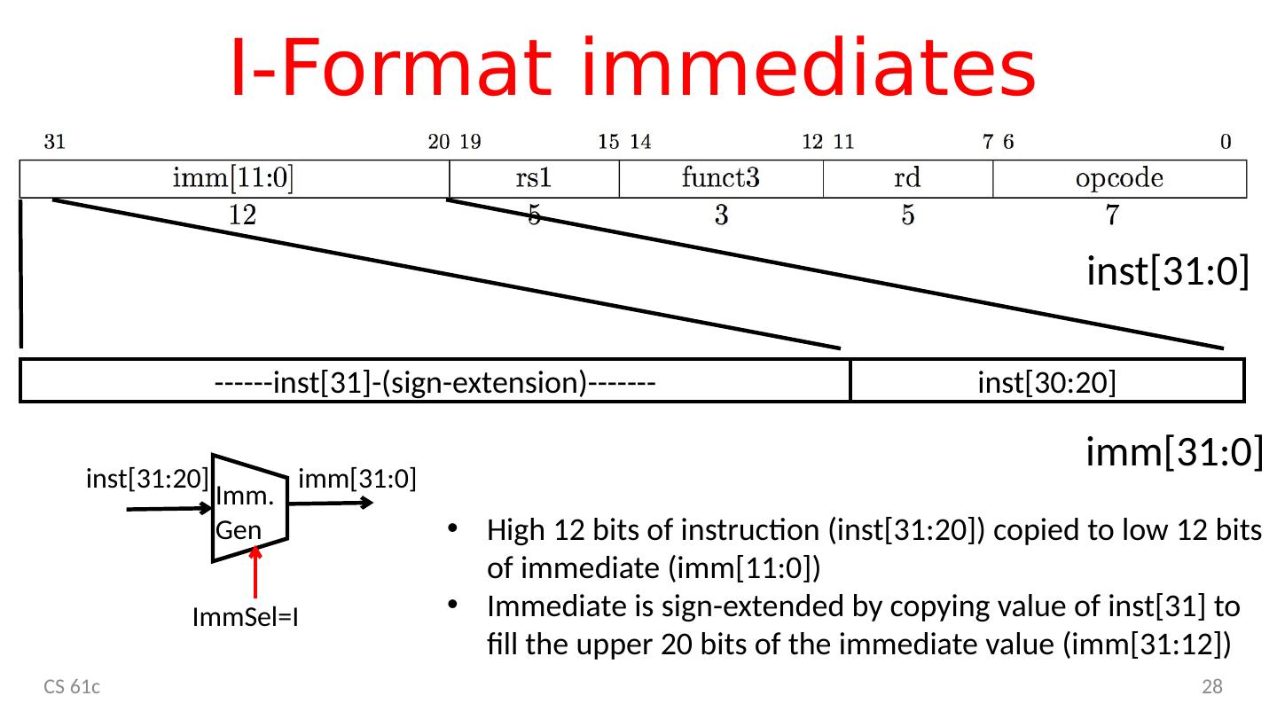 28 .I-Format immediates CS 61c 28 inst [31:0] ------ inst [31]-(sign-extension)------- inst [30:20] imm [31:0] Imm . Gen inst [31:20] imm [31:0] ImmSel =I H igh 12 bits of instruction ( inst [31:20 ]) copied to low 12 bits of immediate ( imm [11:0] ) Immediate is sign-extended by copying value of inst [31] to fill the upper 20 bits of the immediate value ( imm [31:12])