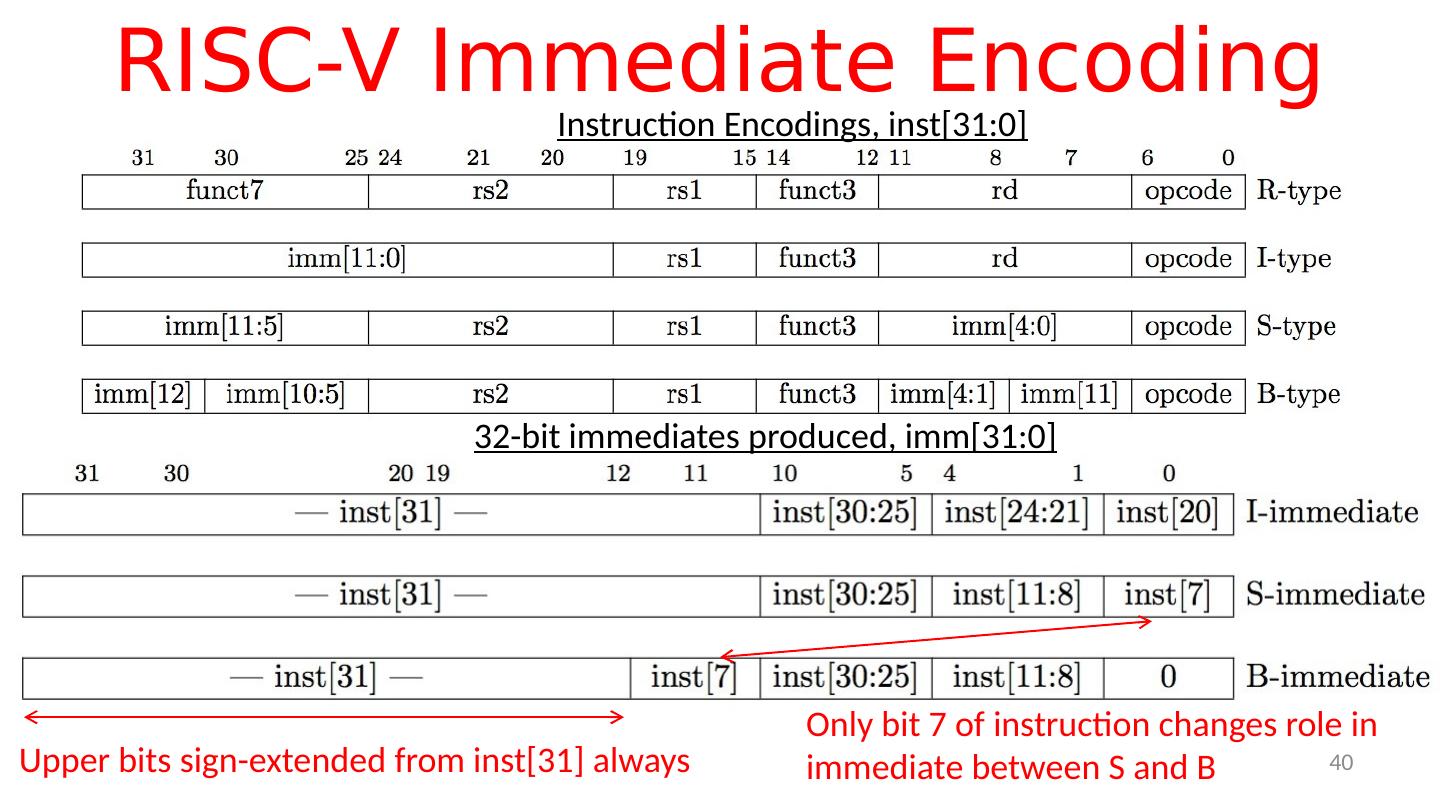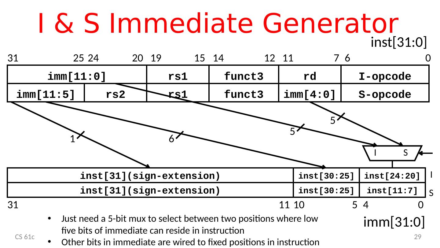 29 .I & S Immediate Generator CS 61c 29 imm [11:5] rs2 rs1 funct3 imm [4:0] S- opcode imm [11:0] rs1 funct 3 rd I- opcode inst [31](sign-extension) inst [30:25] imm [31:0] inst [31:0] inst [24:20] S I inst [31](sign-extension) inst [30:25] inst [11:7] 0 6 7 11 12 14 15 19 20 24 25 31 0 4 5 10 11 3 1 1 6 5 5 S I Just need a 5-bit mux to select between two positions where low five bits of immediate can reside in instruction Other bits in immediate are wired to fixed positions in instruction