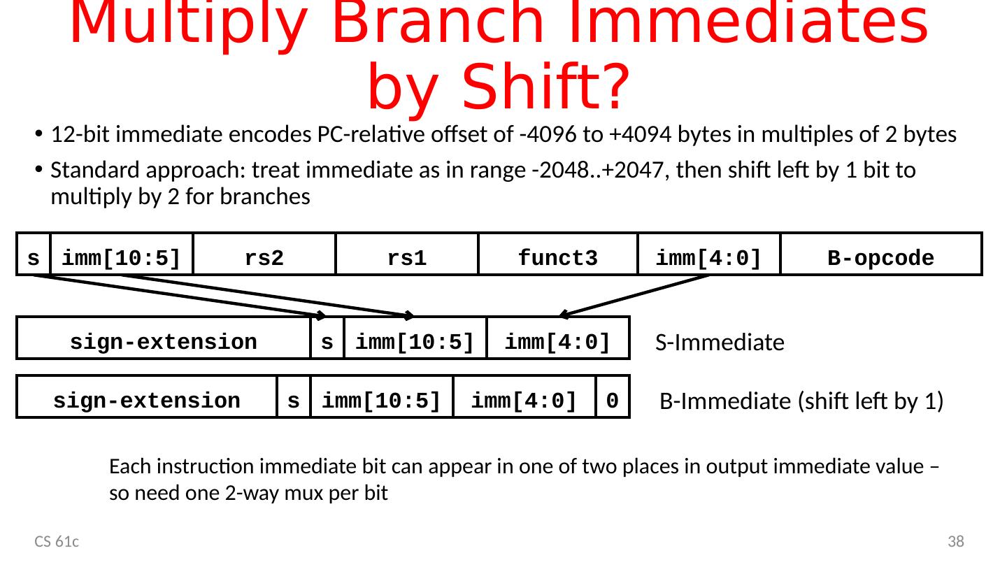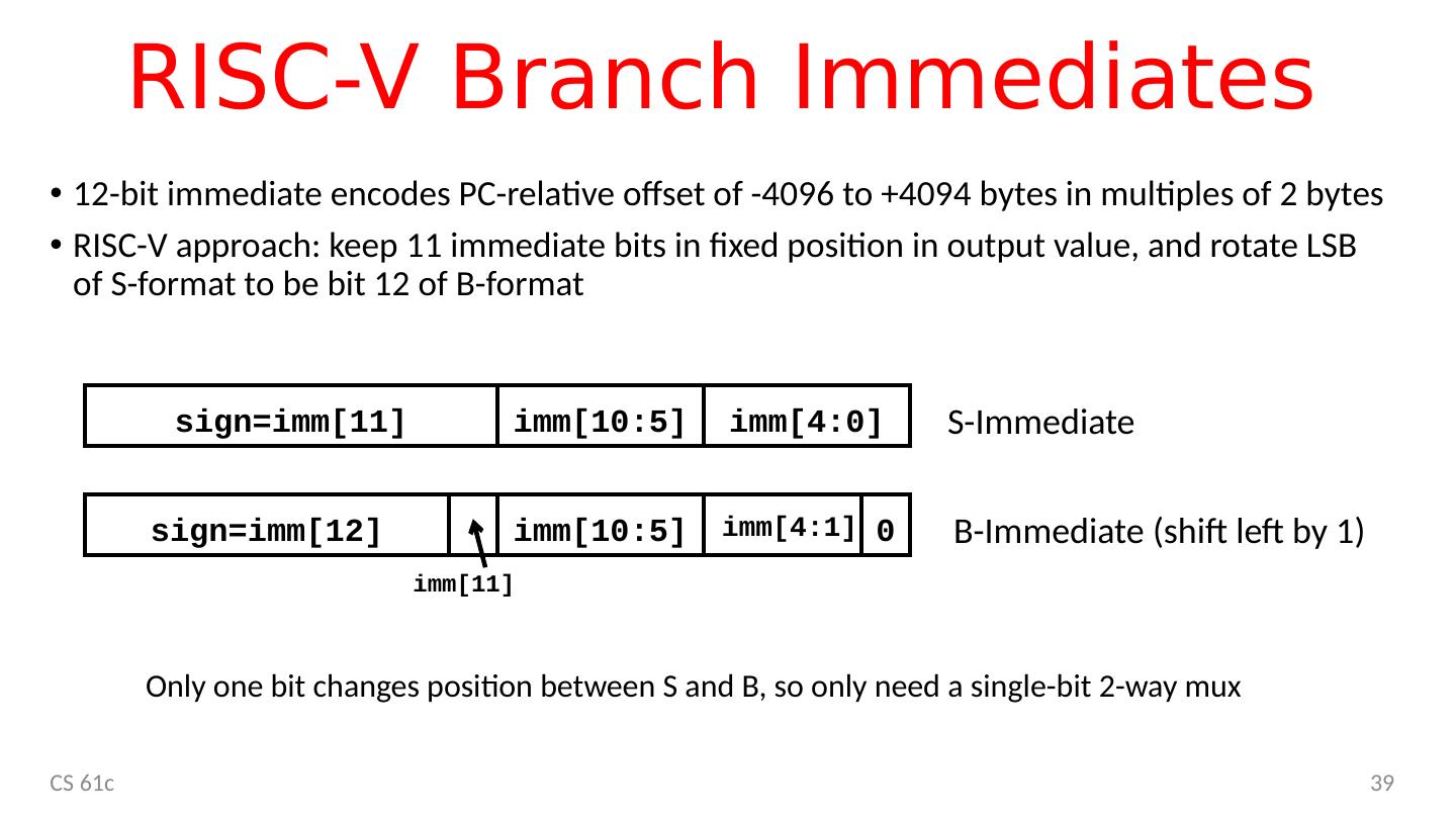 15 .I-Format immediates CS 61c 15 inst [31:0] ------ inst [31]-(sign-extension)------- inst [30:20] imm [31:0] Imm . Gen inst [31:20] imm [31:0] ImmSel =I H igh 12 bits of instruction ( inst [31:20 ]) copied to low 12 bits of immediate ( imm [11:0] ) Immediate is sign-extended by copying value of inst [31] to fill the upper 20 bits of the immediate value ( imm [31:12])