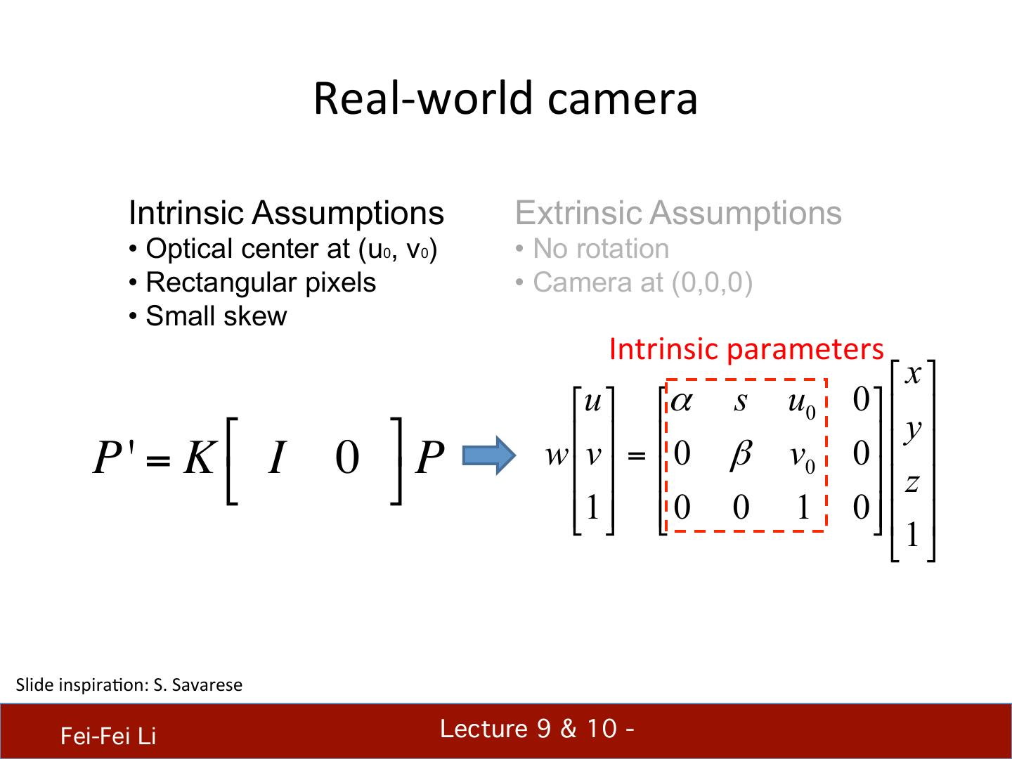 6 . Real-‐world camera Intrinsic Assumptions Extrinsic Assumptions • Optical center at (u0, v0) • No rotation • Rectangular pixels • Camera at (0,0,0) • Small skew Intrinsic parameters ⎡ x ⎤ ⎡u ⎤ ⎡α s u0 0⎤ ⎢ ⎥ ! # y P' = K" I 0 $P w ⎢ v ⎥ = ⎢ 0 β v0 ⎥ 0 ⎢ ⎥ ⎢ ⎥ ⎢ ⎥ ⎢ z ⎥ ⎢⎣1 ⎥⎦ ⎢⎣ 0 0 1 0⎥⎦ ⎢ ⎥ ⎣ 1 ⎦ Slide inspiraBon: S. Savarese Fei-Fei Li! Lecture 9 & 10 - !