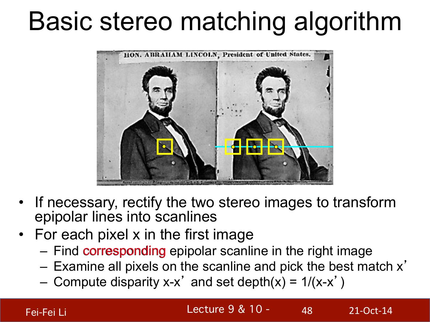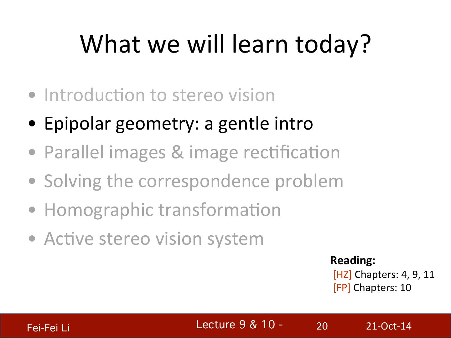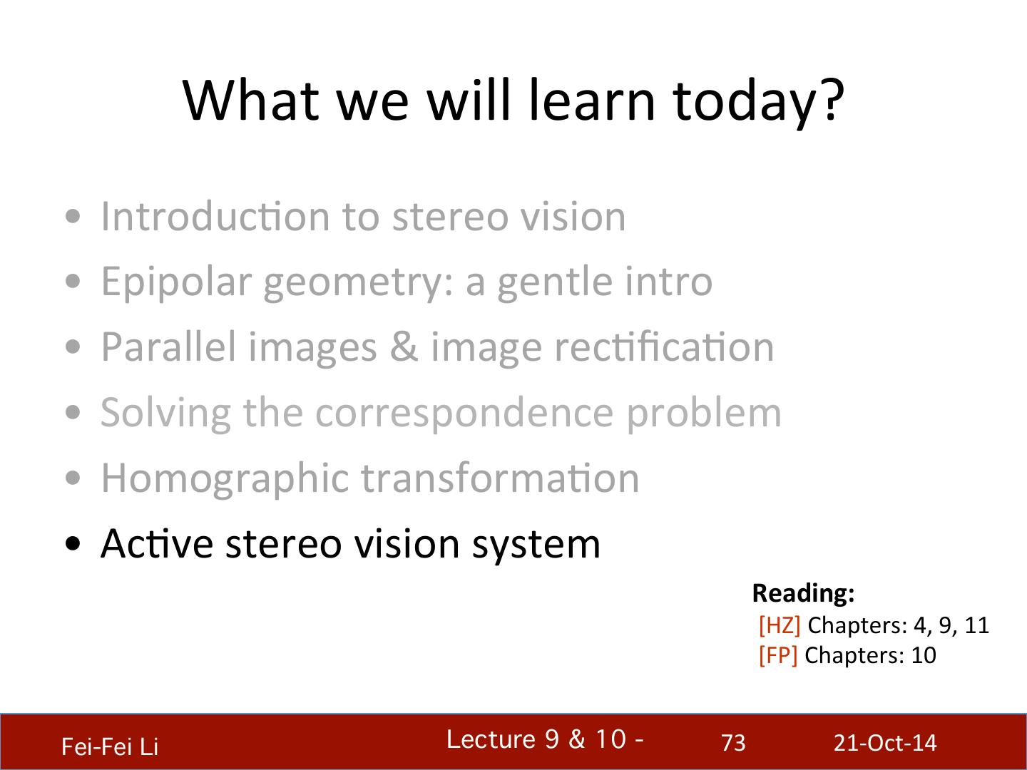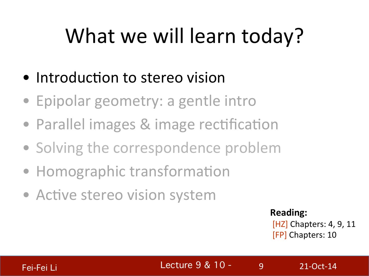 1 . Lecture 9 & 10: Stereo Vision Professor Fei-‐Fei Li Stanford Vision Lab Fei-Fei Li! Lecture 9 & 10 - ! 1 21-‐Oct-‐14