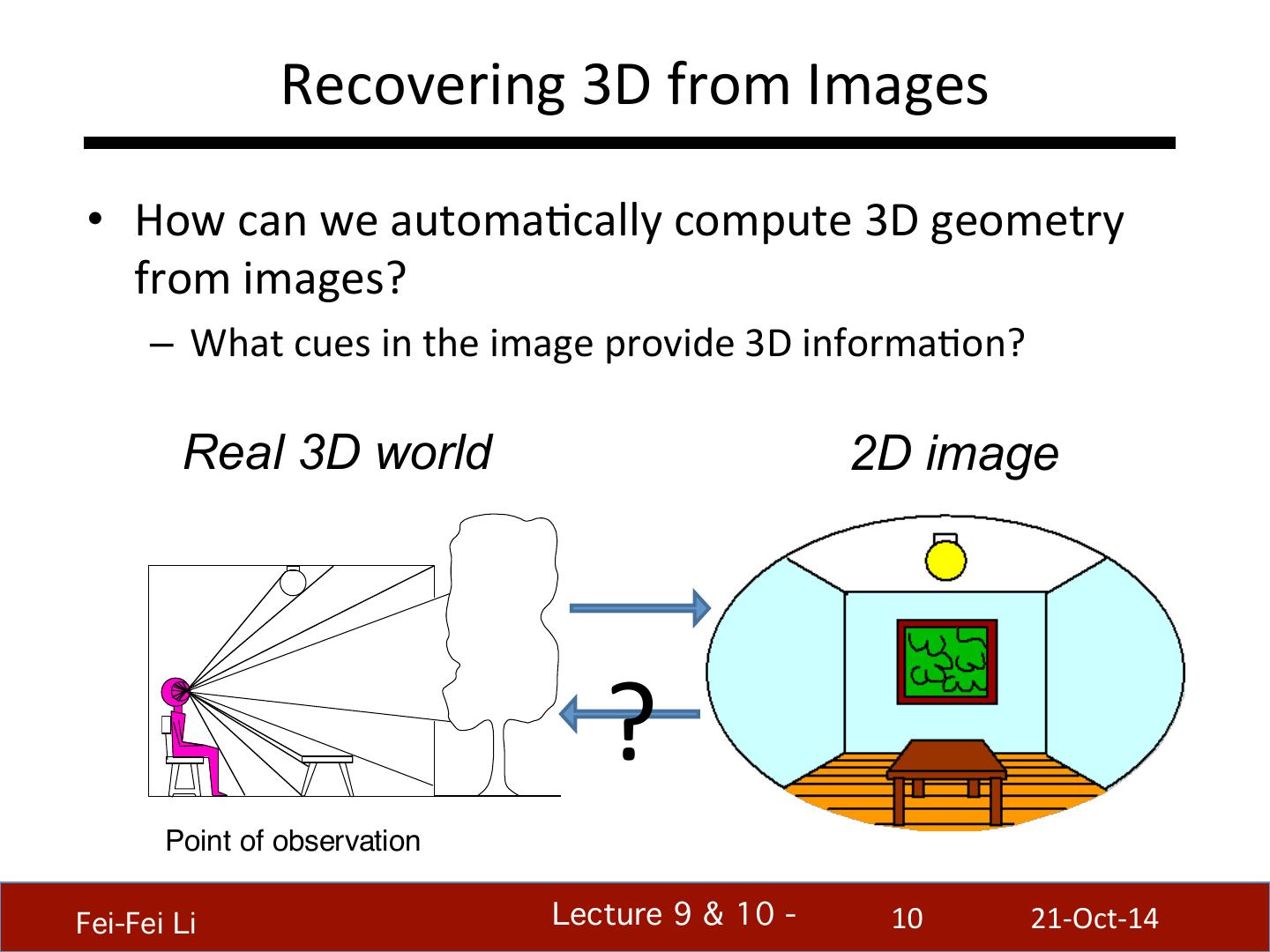 10 . Recovering 3D from Images • How can we automaBcally compute 3D geometry from images? – What cues in the image provide 3D informaBon? Real 3D world 2D image ? Point of observation Fei-Fei Li! Lecture 9 & 10 - ! 10 21-‐Oct-‐14