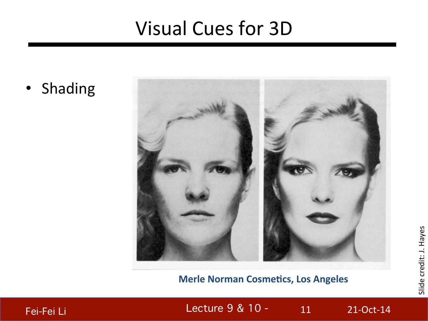 11 . Visual Cues for 3D • Shading Slide credit: J. Hayes Merle Norman Cosme5cs, Los Angeles Fei-Fei Li! Lecture 9 & 10 - ! 11 21-‐Oct-‐14