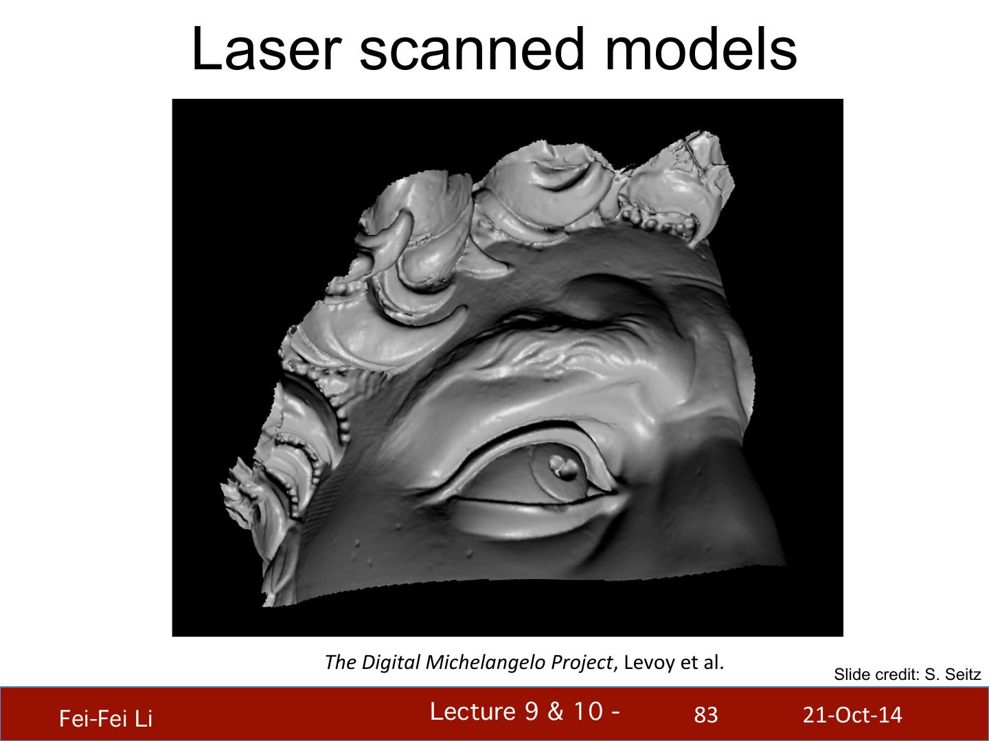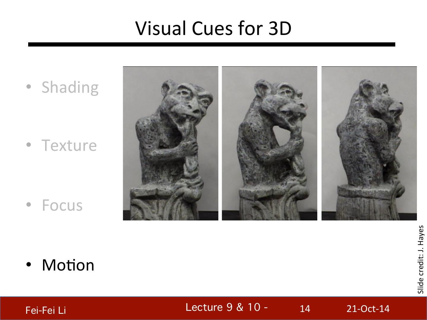 13 . Visual Cues for 3D • Shading • Texture • Focus Slide credit: J. Hayes From The Art of Photography, Canon Fei-Fei Li! Lecture 9 & 10 - ! 13 21-‐Oct-‐14