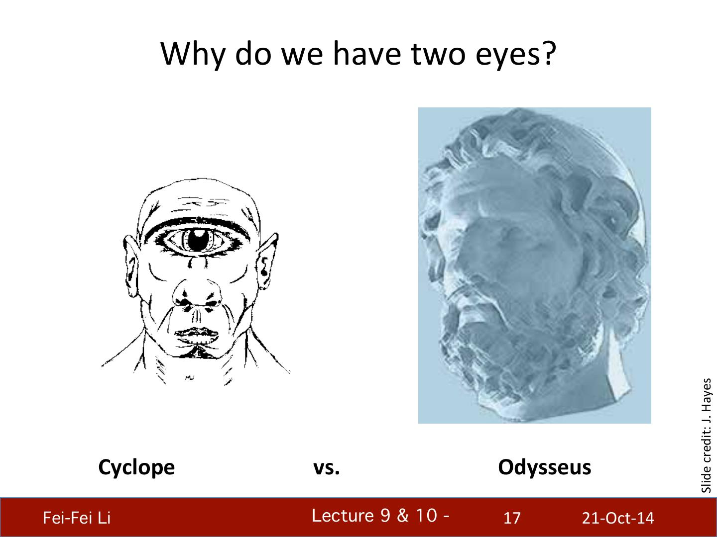 17 . Why do we have two eyes? Slide credit: J. Hayes Cyclope vs. Odysseus Fei-Fei Li! Lecture 9 & 10 - ! 17 21-‐Oct-‐14