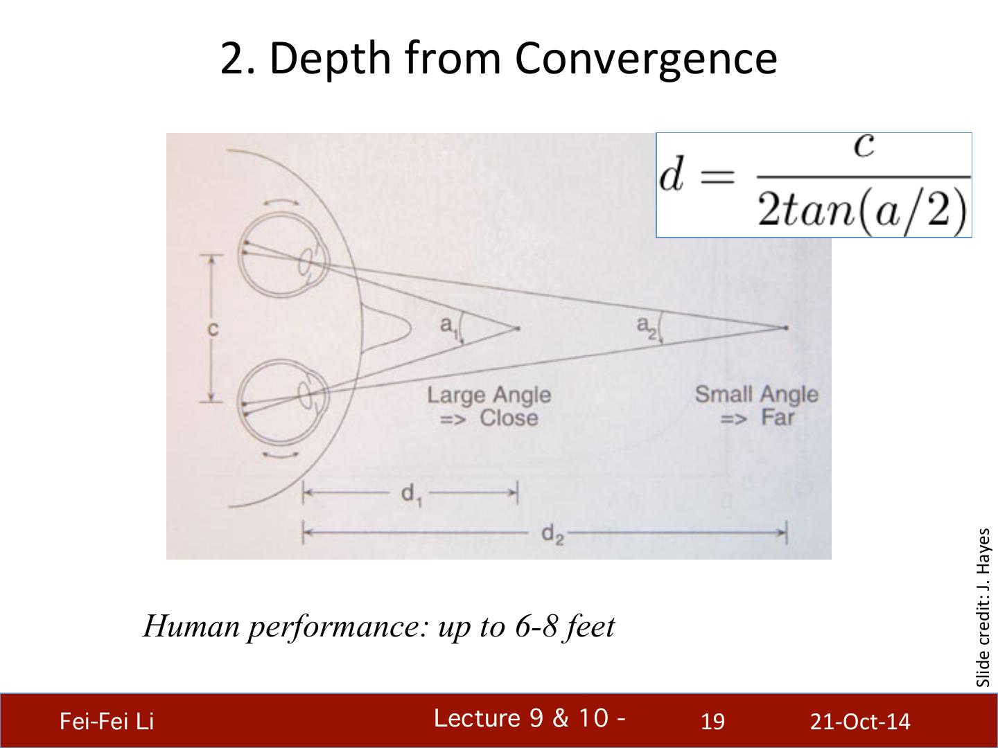 19 . 2. Depth from Convergence Slide credit: J. Hayes Human performance: up to 6-8 feet Fei-Fei Li! Lecture 9 & 10 - ! 19 21-‐Oct-‐14