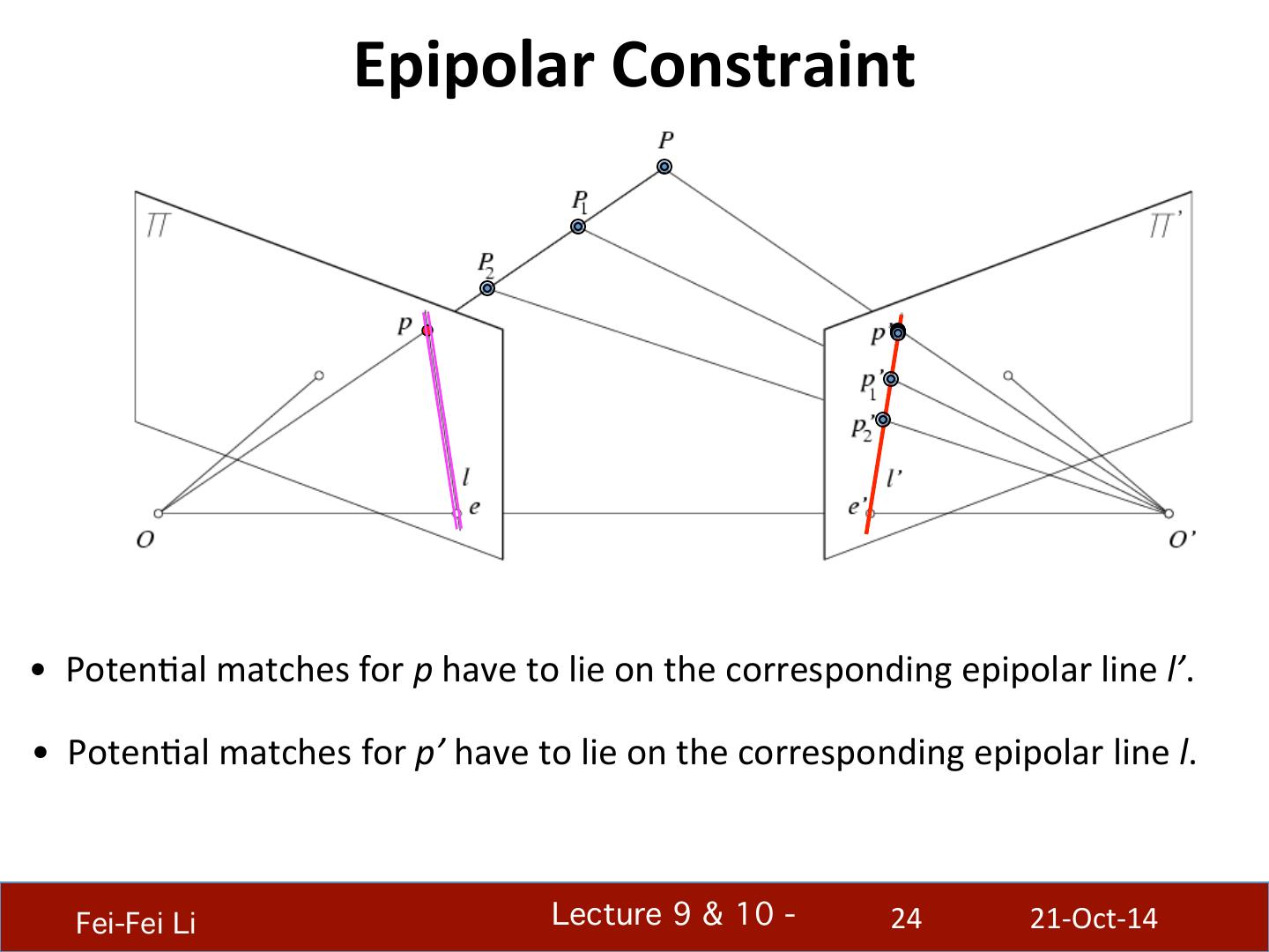 23 . Epipolar Constraint -‐ Two views of the same object -‐ Suppose I know the camera posiBons and camera matrices -‐ Given a point on lem image, how can I find the corresponding point on right image? Fei-Fei Li! Lecture 9 & 10 - ! 23 21-‐Oct-‐14