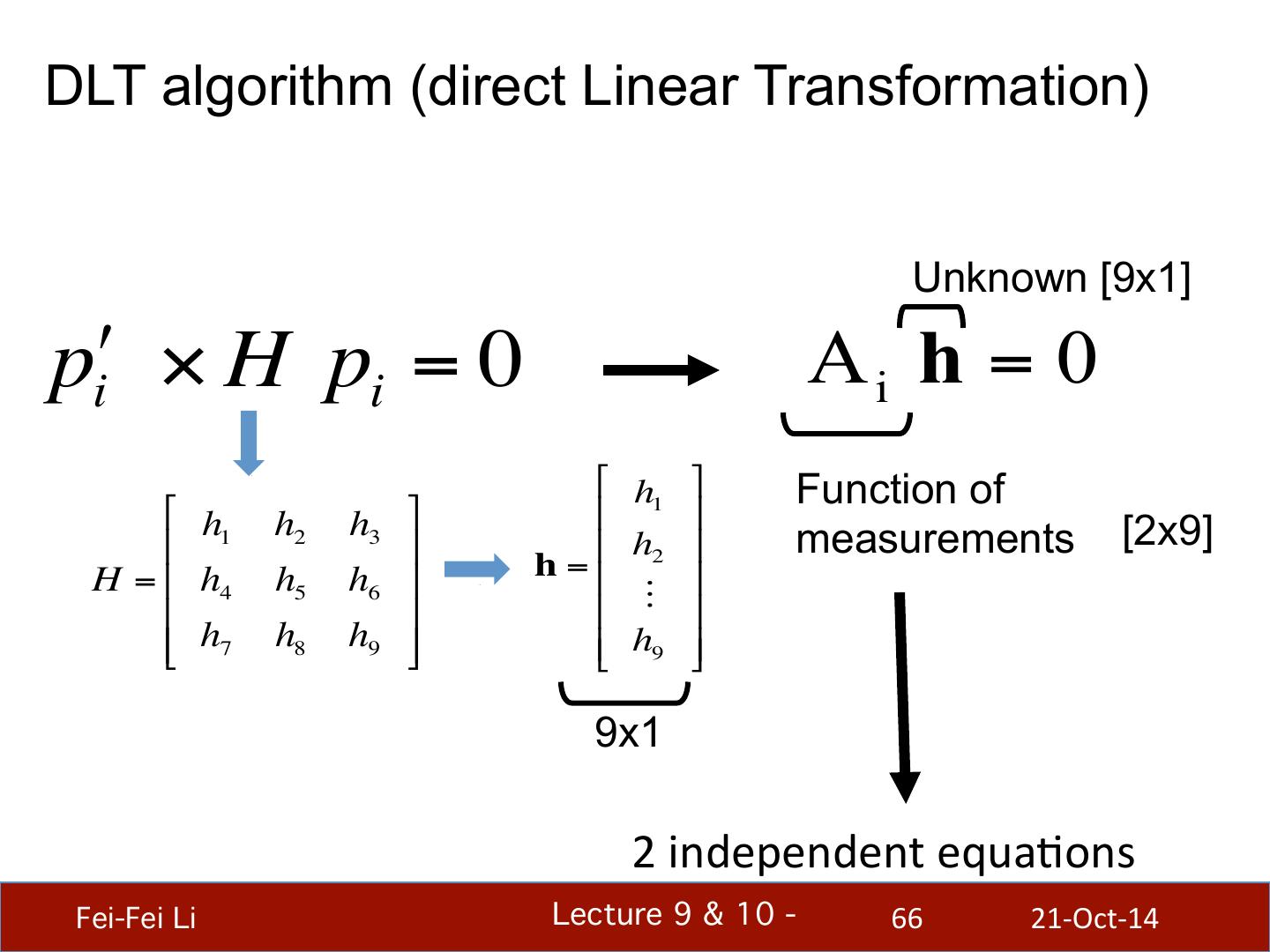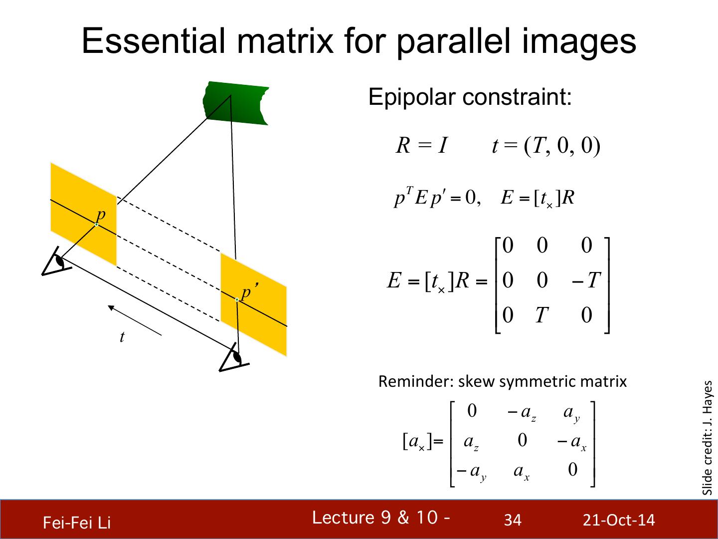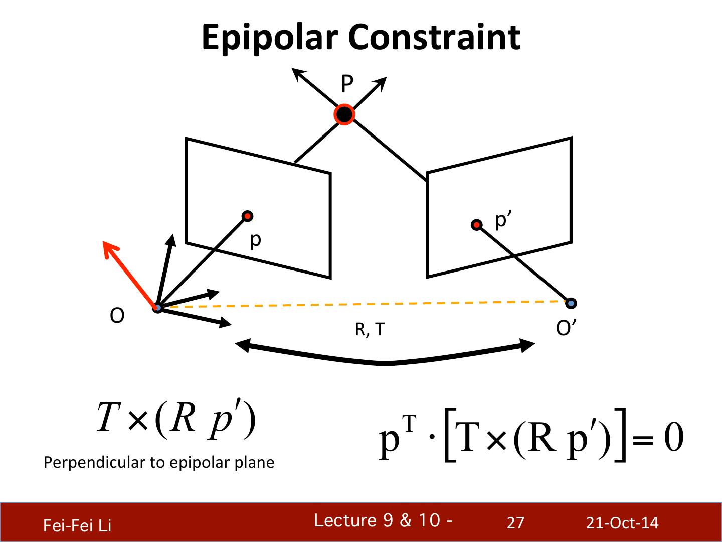 27 . Epipolar Constraint P p’ p O R, T O’ T × ( R pʹ′) T p ⋅ [T × (R pʹ′)] = 0 Perpendicular to epipolar plane Fei-Fei Li! Lecture 9 & 10 - ! 27 21-‐Oct-‐14