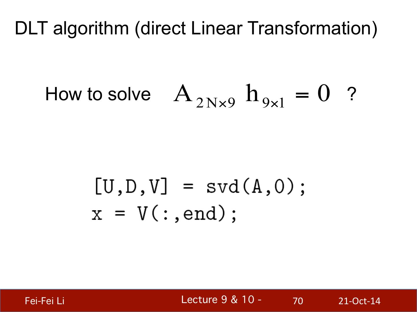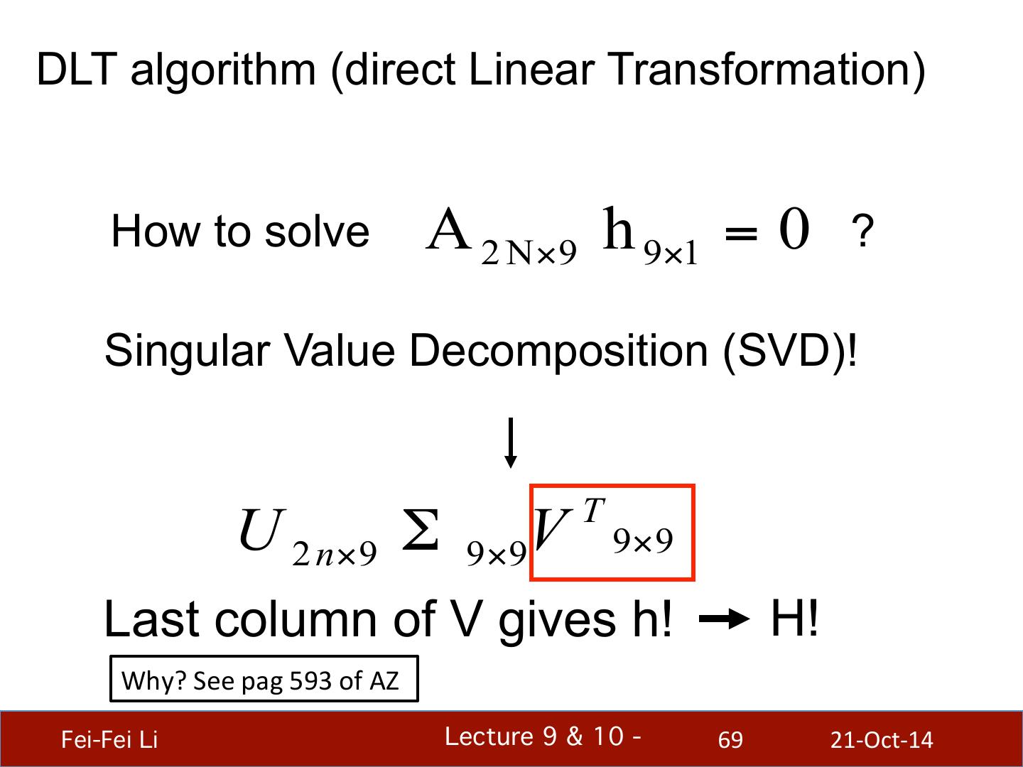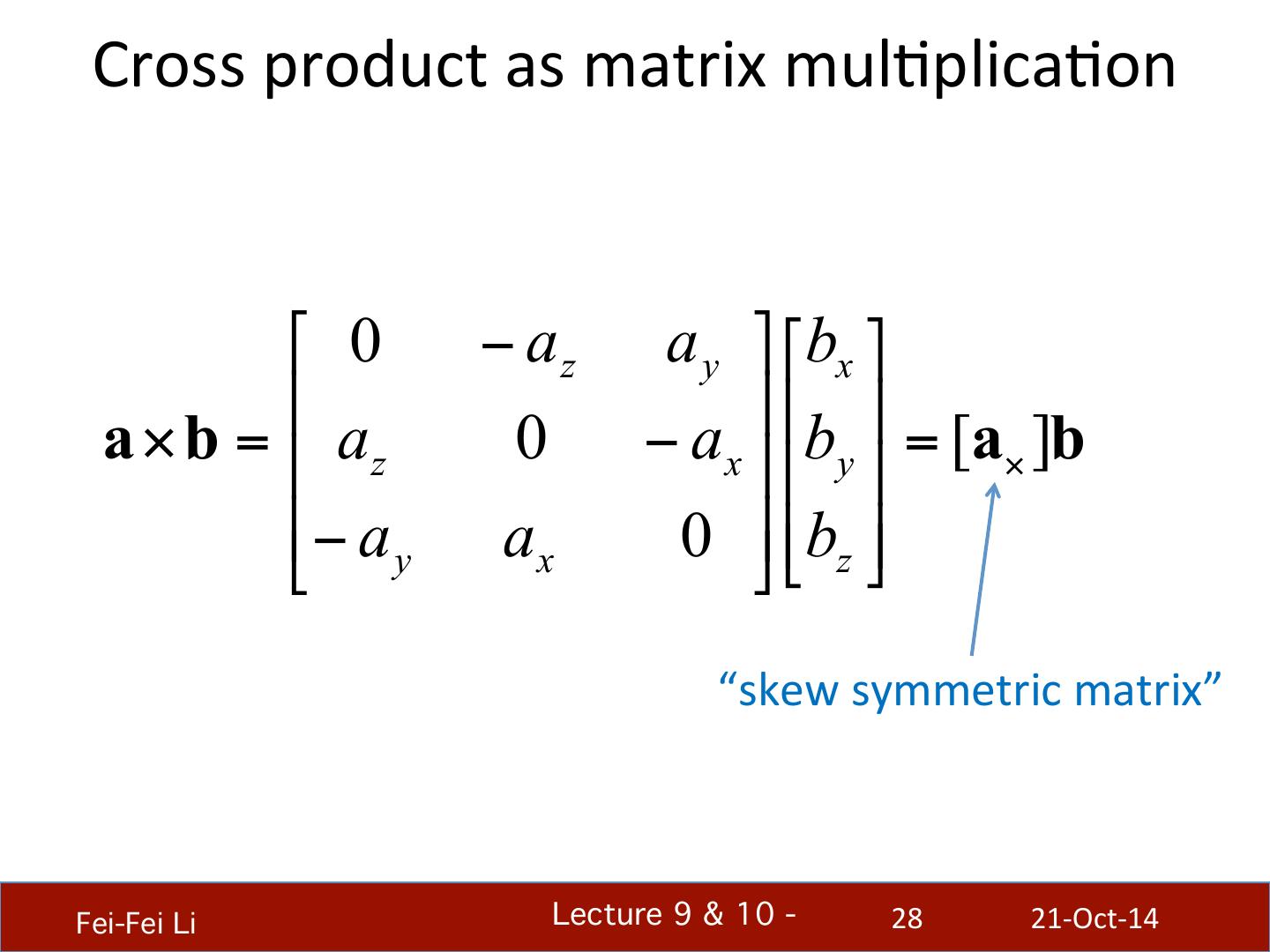 28 . Cross product as matrix mulBplicaBon ⎡ 0 − az a y ⎤ ⎡bx ⎤ ⎢ ⎥ ⎢ ⎥ a × b = ⎢ az 0 − ax ⎥ ⎢by ⎥ = [a× ]b ⎢− a y ax 0 ⎥⎦ ⎢⎣bz ⎥⎦ ⎣ “skew symmetric matrix” Fei-Fei Li! Lecture 9 & 10 - ! 28 21-‐Oct-‐14