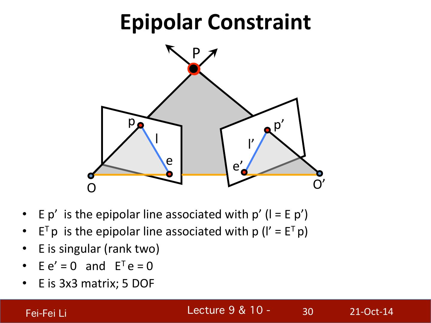 29 . Epipolar Constraint P p’ p O R, T O’ T T p ⋅ [T × (R pʹ′)] = 0 → p ⋅ [T× ]⋅ R pʹ′ = 0 (Longuet-‐Higgins, 1981) E = essenBal matrix Fei-Fei Li! Lecture 9 & 10 - ! 29 21-‐Oct-‐14