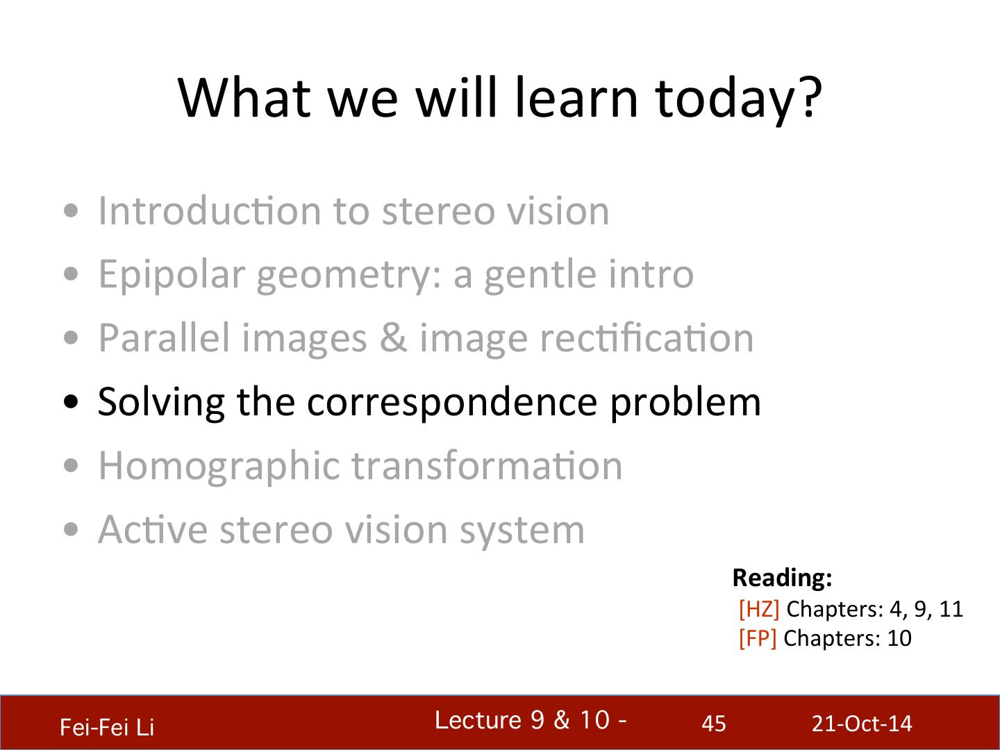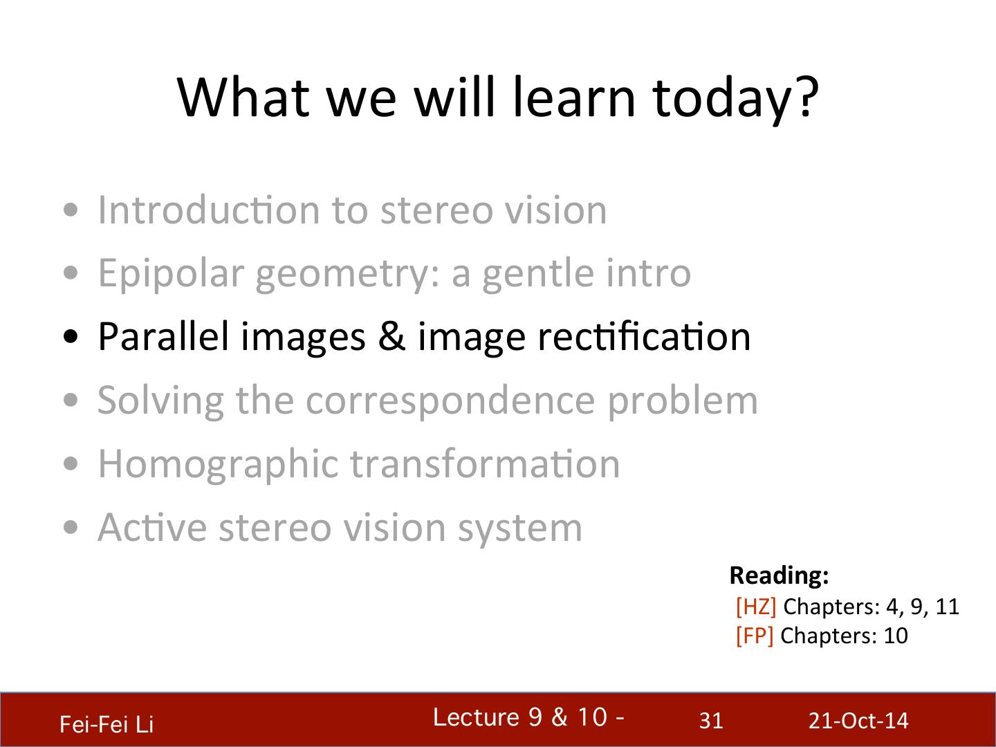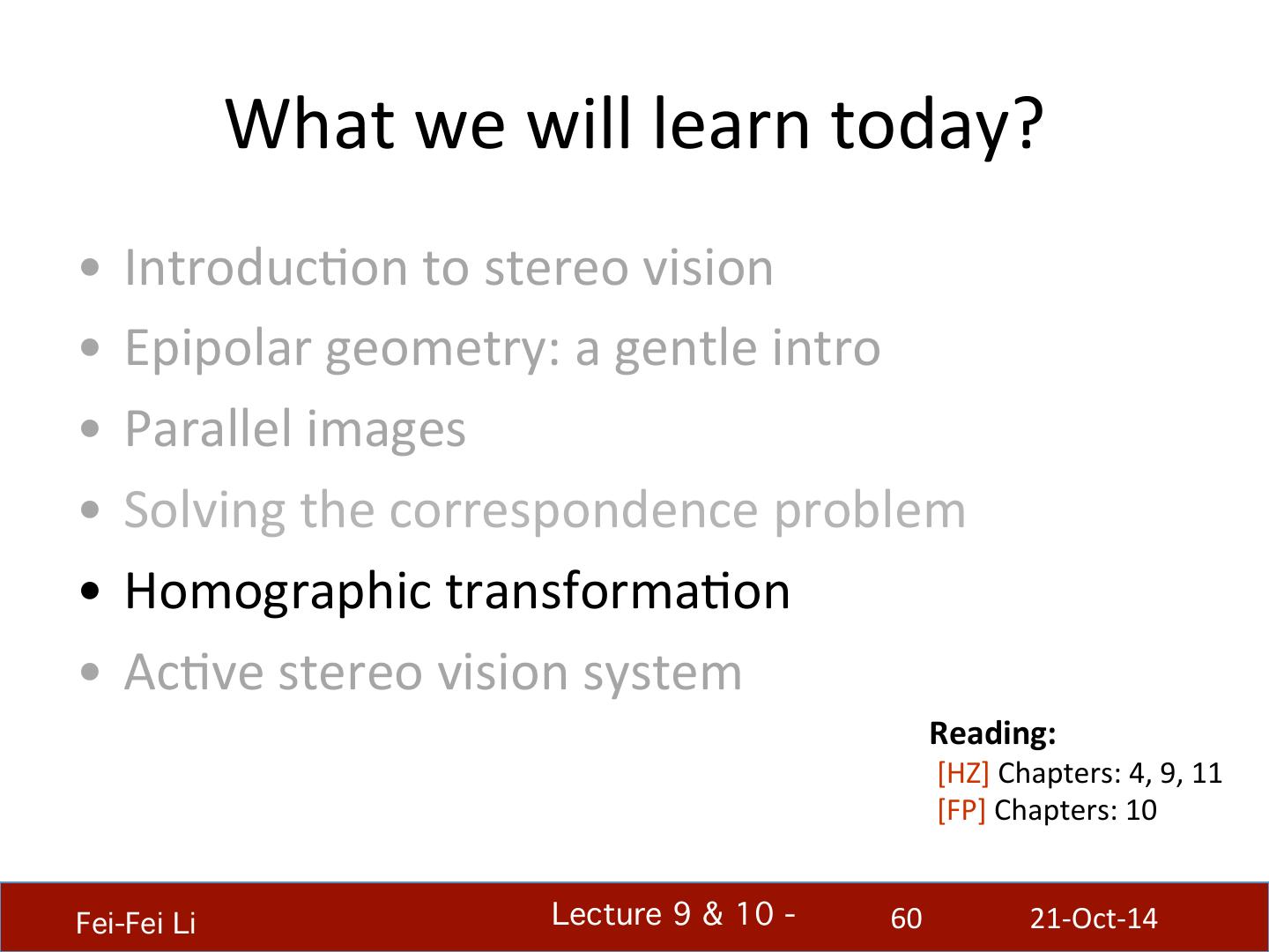20 . What we will learn today? • IntroducBon to stereo vision • Epipolar geometry: a gentle intro • Parallel images & image recBficaBon • Solving the correspondence problem • Homographic transformaBon • AcBve stereo vision system Reading: [HZ] Chapters: 4, 9, 11 [FP] Chapters: 10 Fei-Fei Li! Lecture 9 & 10 - ! 20 21-‐Oct-‐14