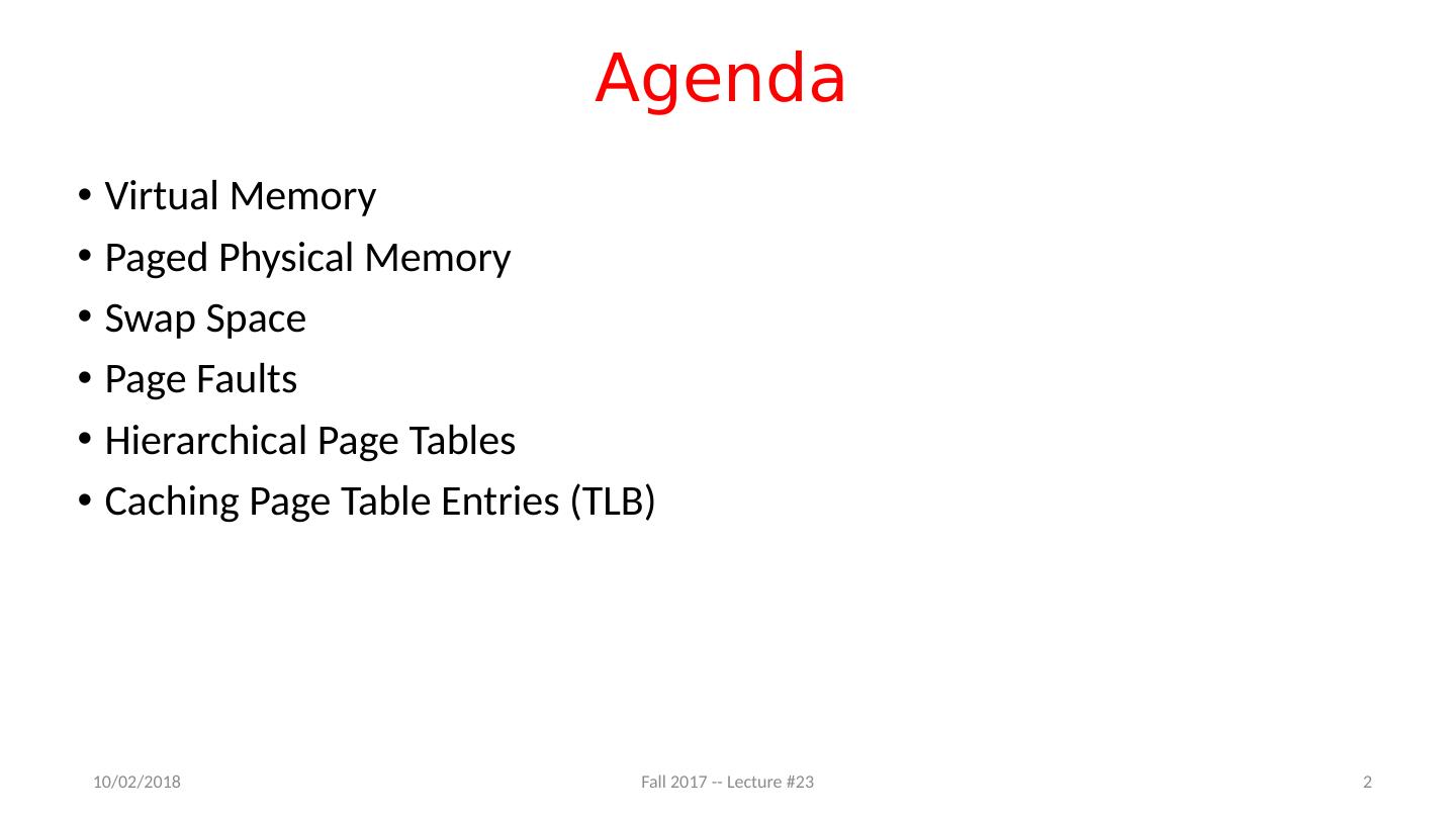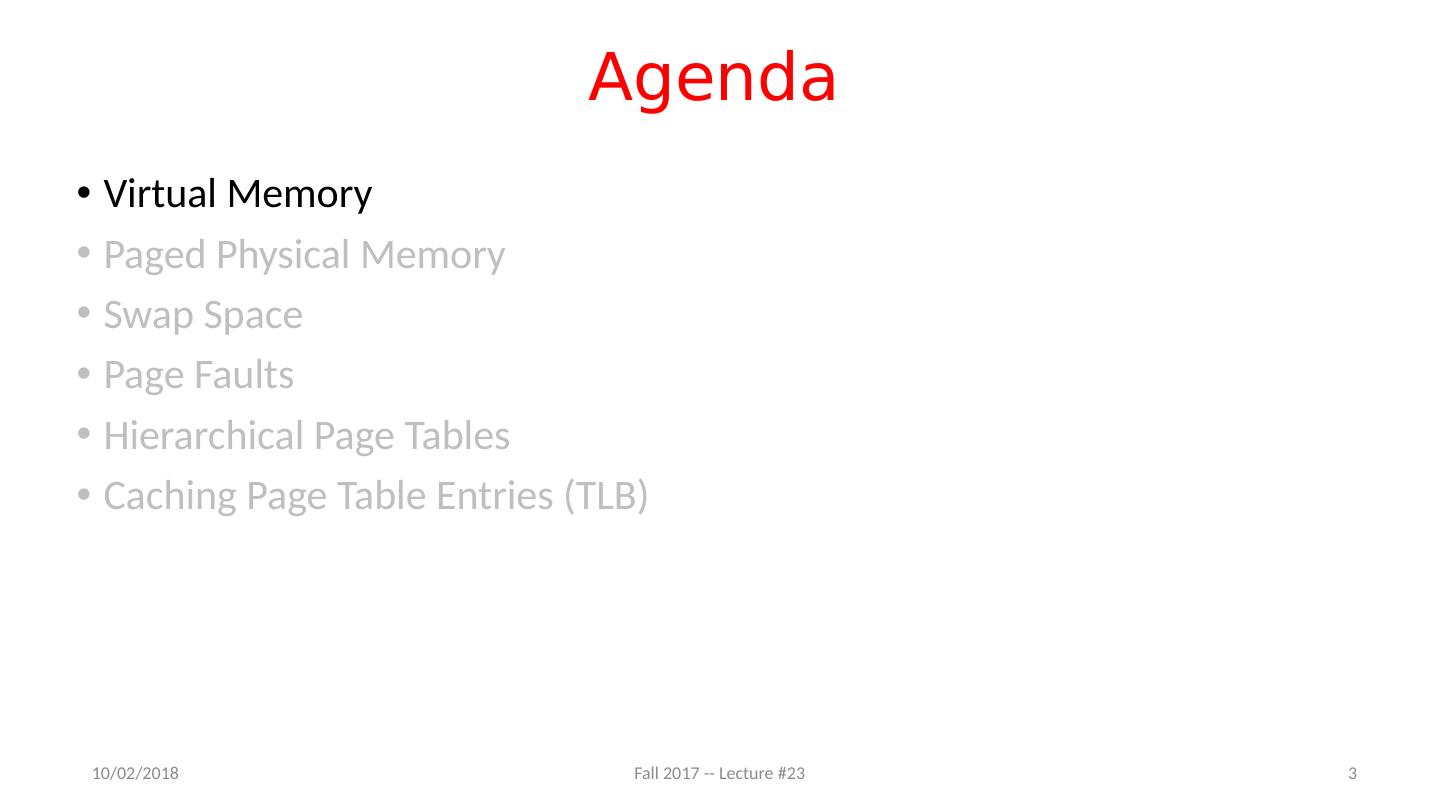 2 .Agenda Virtual Memory Paged Physical Memory Swap Space Page Faults Hierarchical Page Tables Caching Page Table Entries (TLB) 2 Fall 2017 -- Lecture #23 11/15/17