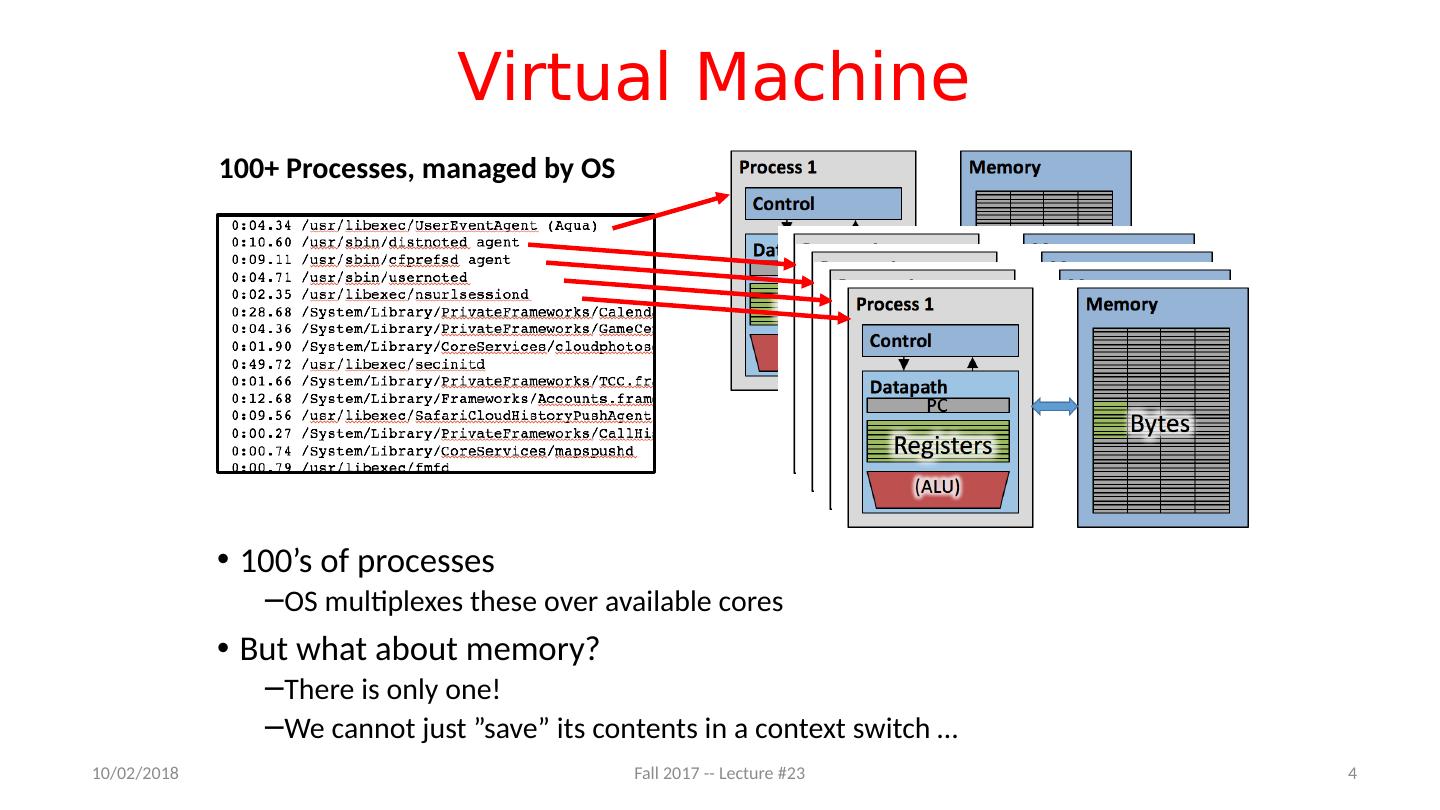 4 .Virtual Machine 100’s of processes OS multiplexes these over available cores But what about memory? There is only one! We cannot just ”save” its contents in a context switch … 100+ Processes, managed by OS 4 Fall 2017 -- Lecture #23 11/15/17