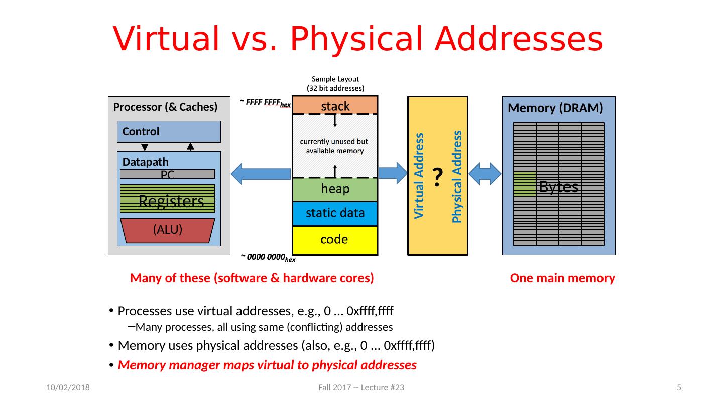 5 .Virtual vs. Physical Addresses Processes use virtual addresses, e.g., 0 … 0xffff,ffff Many processes, all using same (conflicting) addresses Memory uses physical addresses (also, e.g., 0 ... 0xffff,ffff) Memory manager maps virtual to physical addresses Processor (& Caches) Control Datapath PC Registers (ALU) Memory (DRAM) Bytes ? Virtual Address Physical Address Many of these (software & hardware cores) One main memory 5 Fall 2017 -- Lecture #23 11/15/17