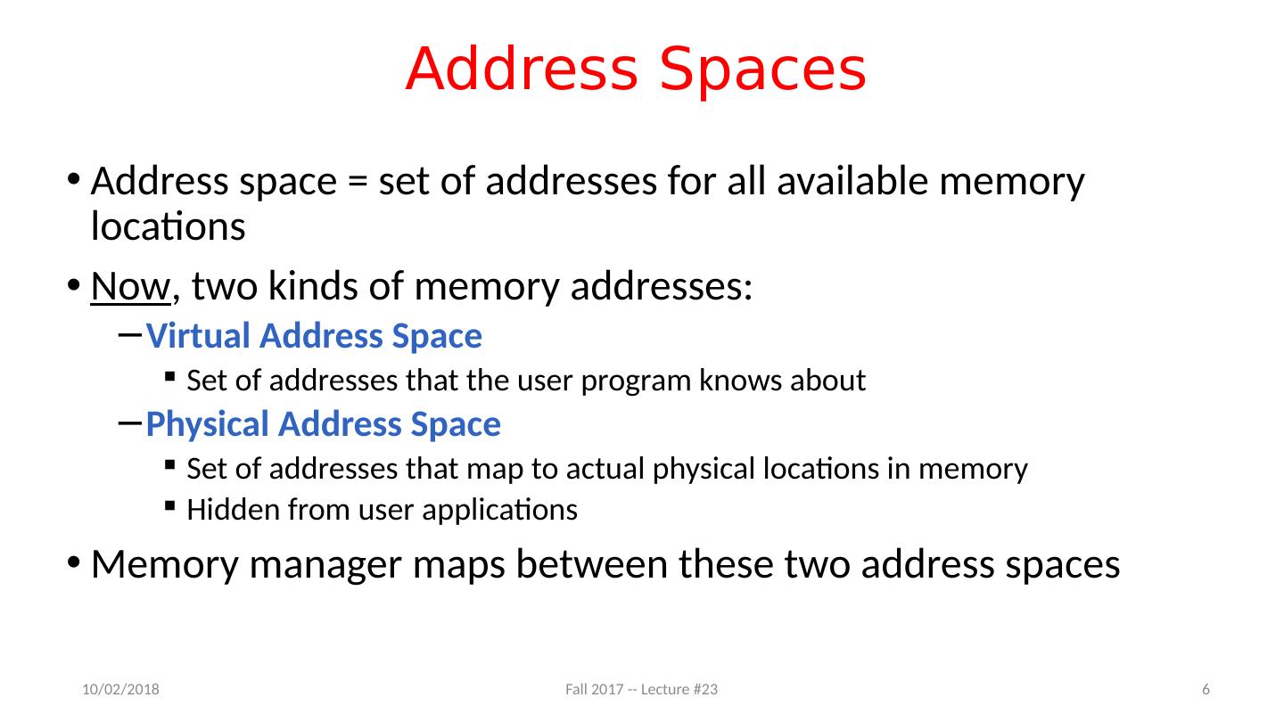 6 .Address Spaces Address space = set of addresses for all available memory locations Now , two kinds of memory addresses: Virtual Address Space S et of addresses that the user program knows about Physical Address Space S et of addresses that map to actual physical locations in memory H idden from user applications Memory manager maps between these two address spaces 6 Fall 2017 -- Lecture #23 11/15/17