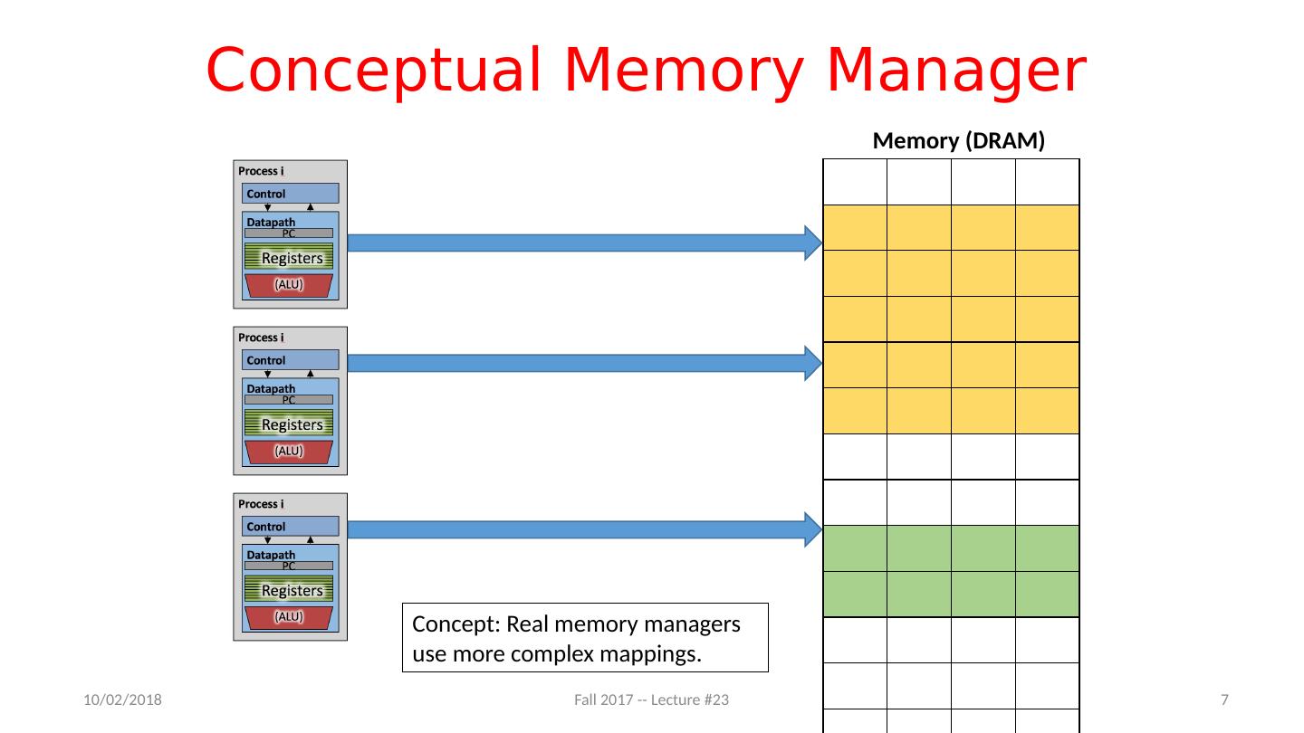 7 .Conceptual Memory Manager Memory (DRAM) Concept: Real memory managers use more complex mappings. 7 Fall 2017 -- Lecture #23 11/15/17