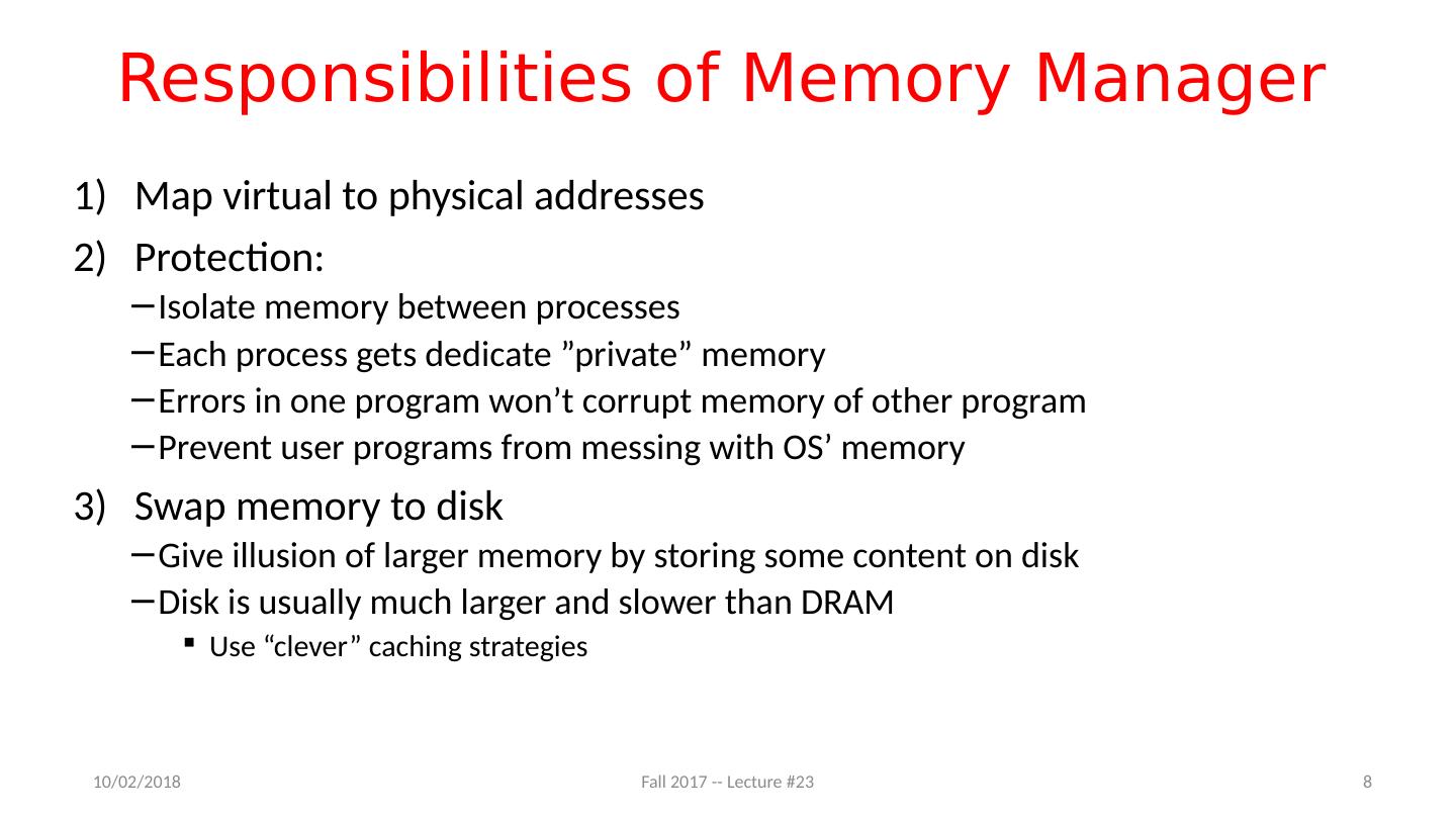 8 .Responsibilities of Memory Manager Map virtual to physical addresses Protection: Isolate memory between processes Each process gets dedicate ”private” memory Errors in one program won’t corrupt memory of other program Prevent user programs from messing with OS’ memory Swap memory to disk Give illusion of larger memory by storing some content on disk Disk is usually much larger and slower than DRAM Use “clever” caching strategies 8 Fall 2017 -- Lecture #23 11/15/17