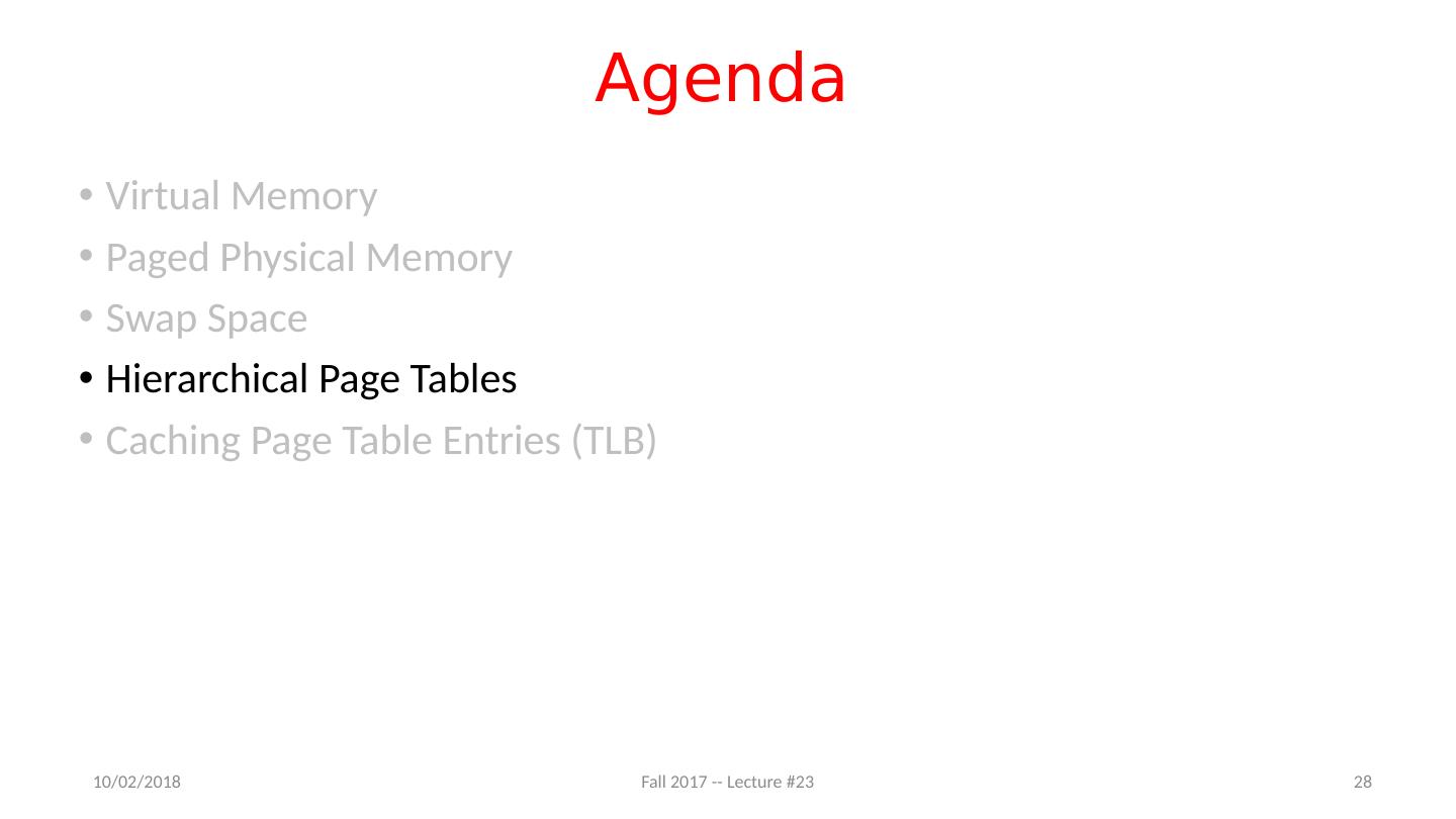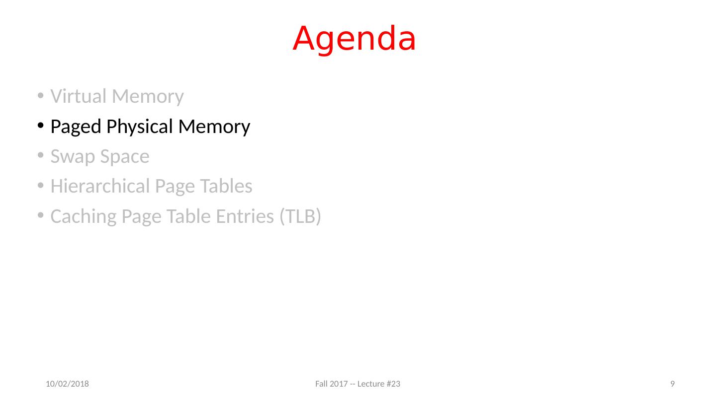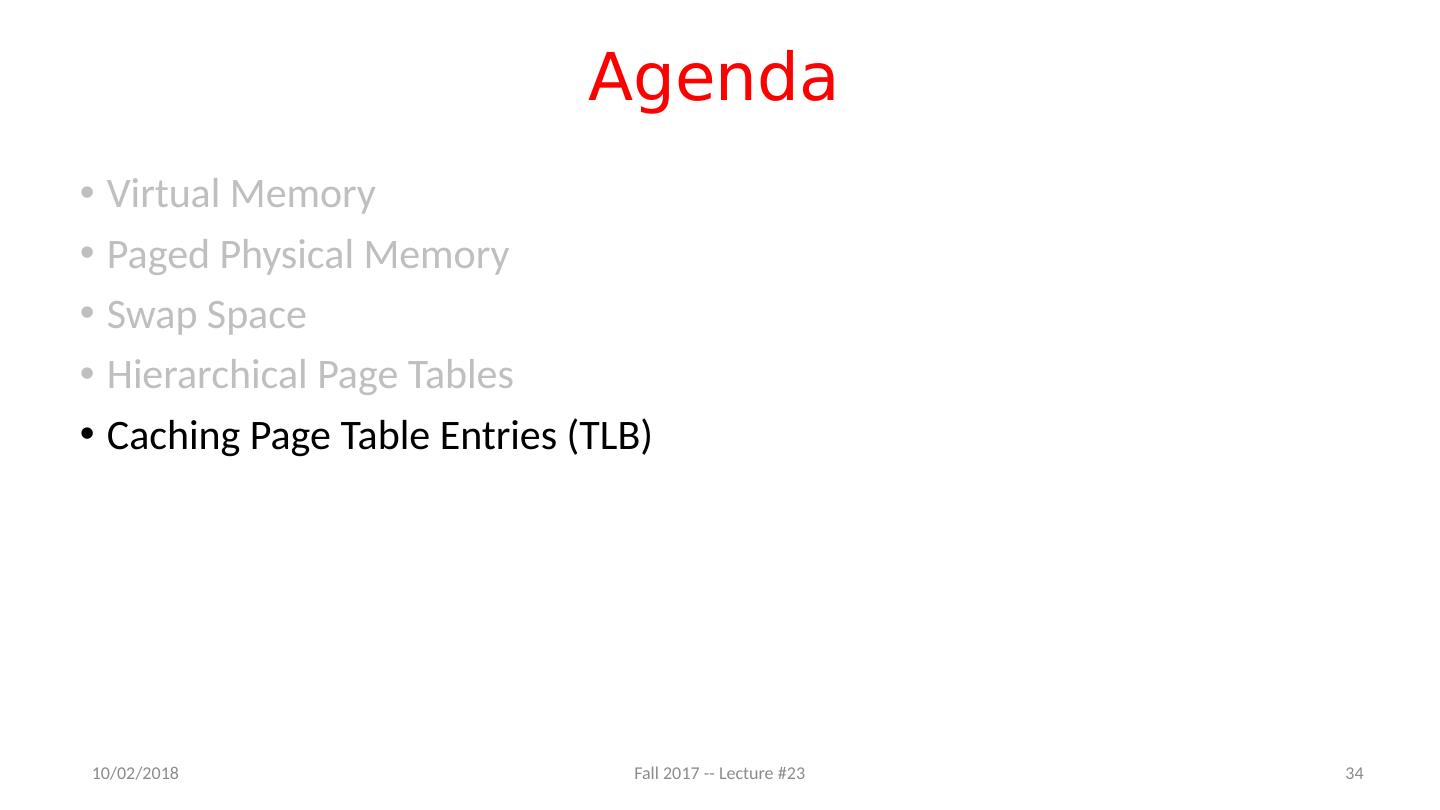 9 .Agenda Virtual Memory Paged Physical Memory Swap Space Hierarchical Page Tables Caching Page Table Entries (TLB) 9 Fall 2017 -- Lecture #23 11/15/17