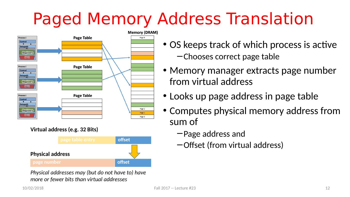 11 .Paged Memory Page N Page 2 Page 1 Page 0 Memory (DRAM) Page Table Page Table Page Table Each process has a dedicated page table. Physical memory non-consecutive. 11 Fall 2017 -- Lecture #23 11/15/17
