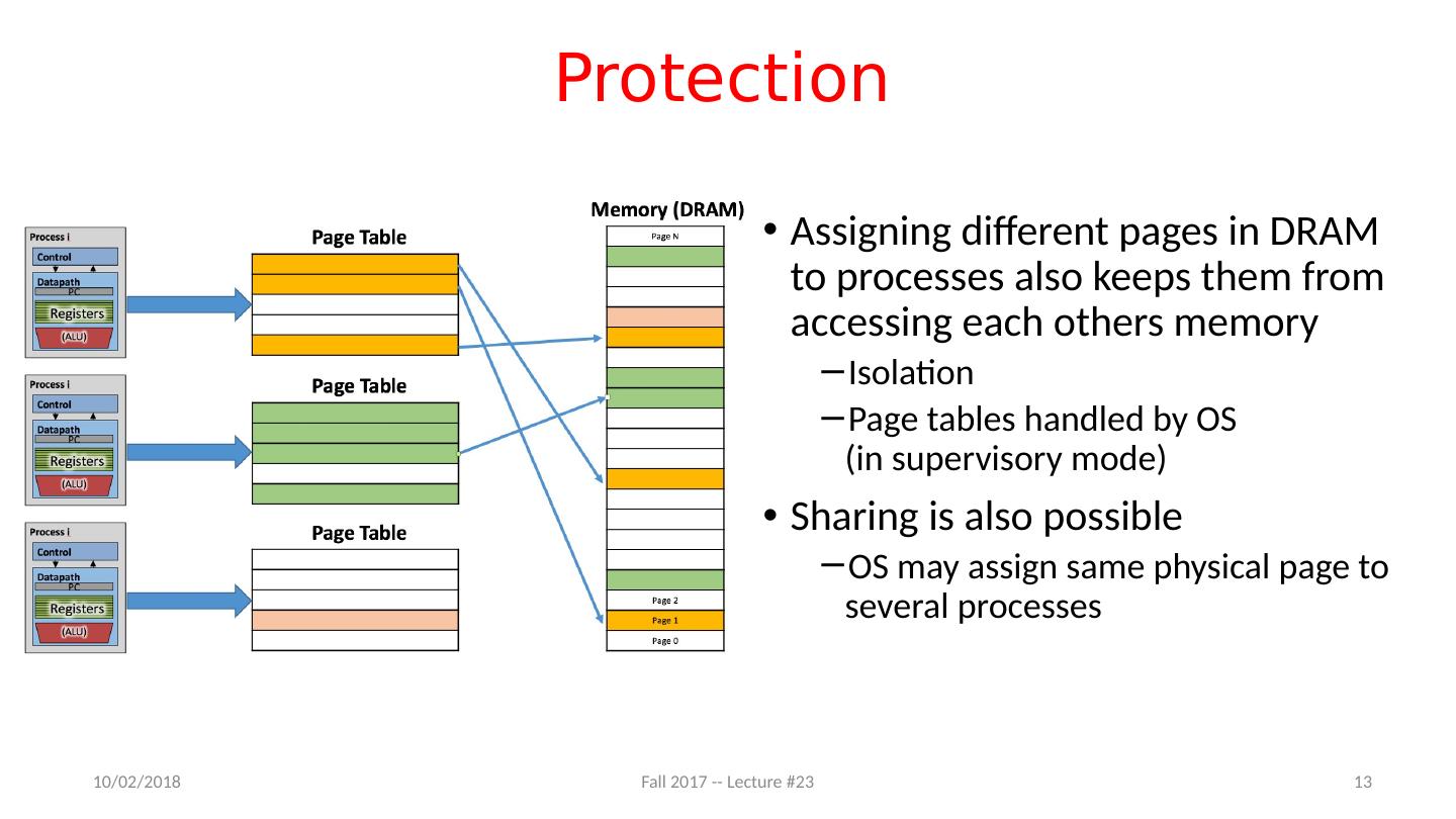 13 .Protection Assigning different pages in DRAM to processes also keeps them from accessing each others memory Isolation Page tables handled by OS (in supervisory mode) Sharing is also possible OS may assign same physical page to several processes 13 Fall 2017 -- Lecture #23 11/15/17
