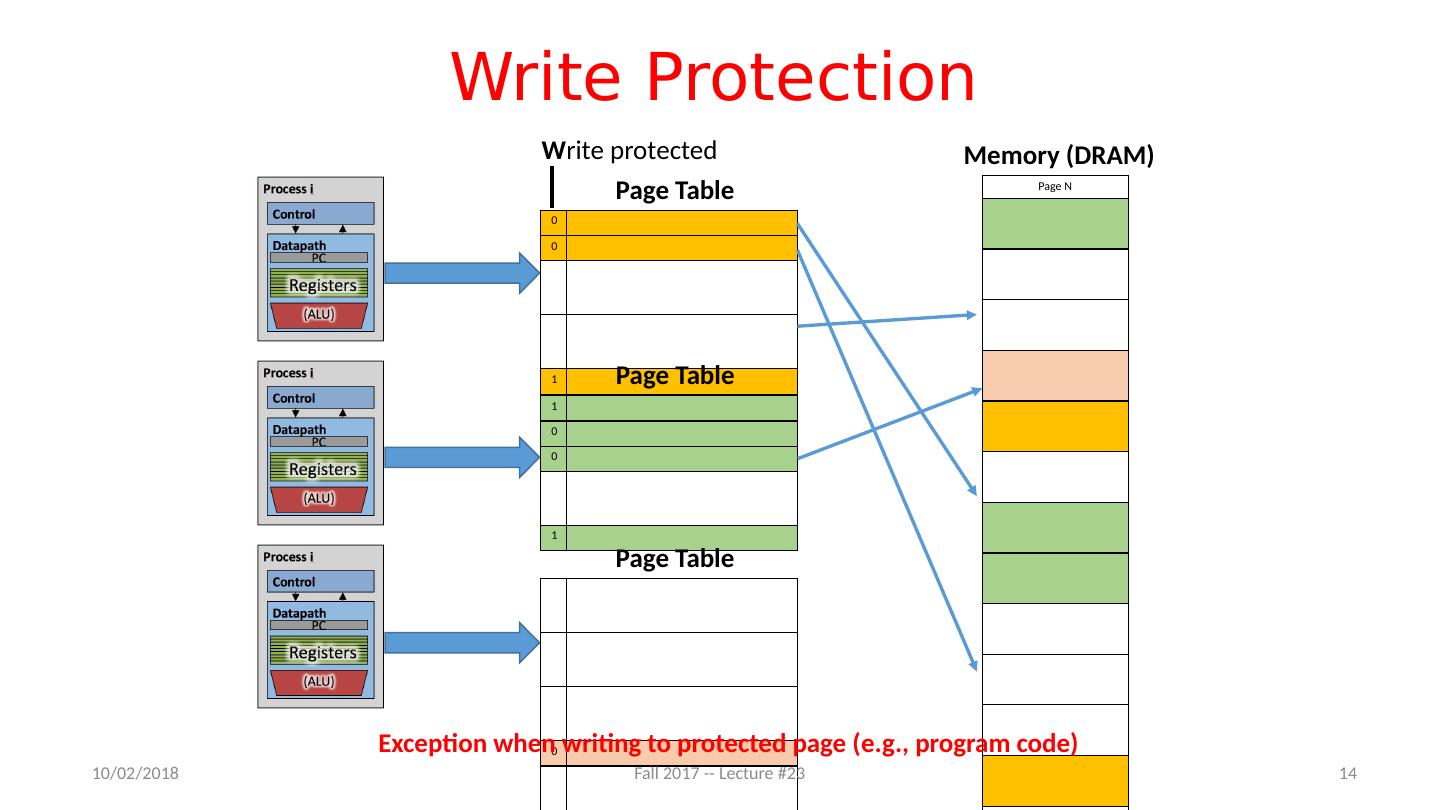 14 .Write Protection Page N Page 2 Page 1 Page 0 Memory (DRAM) 0 0 1 Page Table 1 0 0 1 Page Table 0 Page Table Exception when writing to protected page ( e.g., program code ) W rite protected 14 Fall 2017 -- Lecture #23 11/15/17