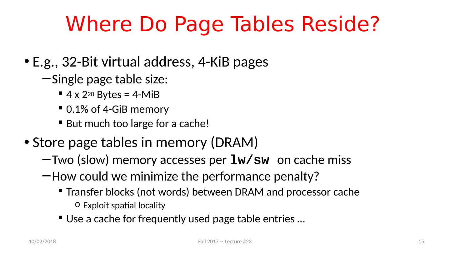 15 .Where Do Page Tables Reside? E.g ., 32-Bit virtual address, 4-KiB pages Single page table size: 4 x 2 20 Bytes = 4-MiB 0.1% of 4-GiB memory But much too large for a cache! Store page tables in memory (DRAM) Two (slow) memory accesses per lw / sw on cache miss How could we minimize the performance penalty? Transfer blocks (not words) between DRAM and processor cache Exploit spatial locality Use a cache for frequently used page table entries … 15 Fall 2017 -- Lecture #23 11/15/17