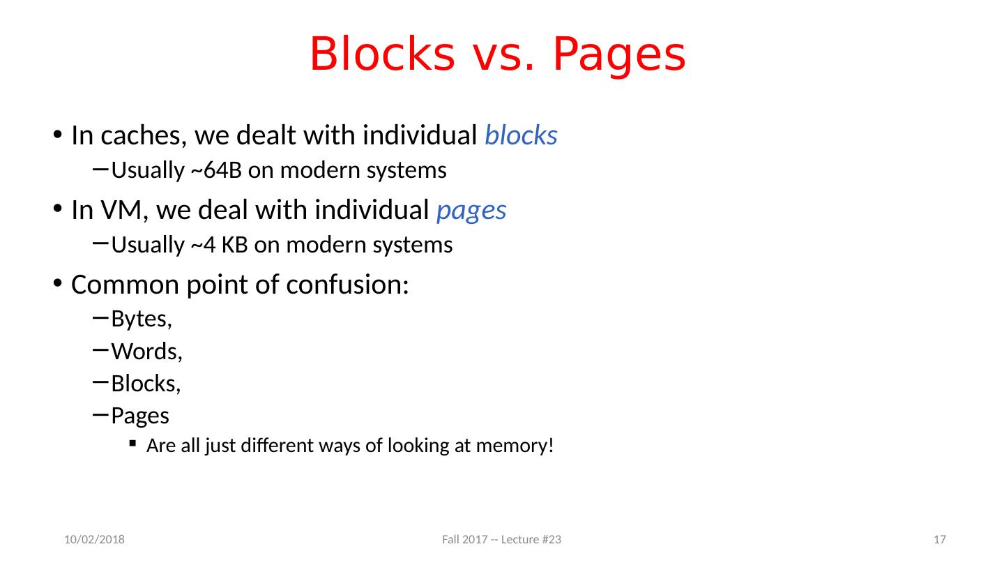 17 .Blocks vs. Pages In caches, we dealt with individual blocks Usually ~64B on modern systems In VM, we deal with individual pages Usually ~4 KB on modern systems Common point of confusion: Bytes, Words, Blocks, Pages Are all just different ways of looking at memory! 17 Fall 2017 -- Lecture #23 11/15/17