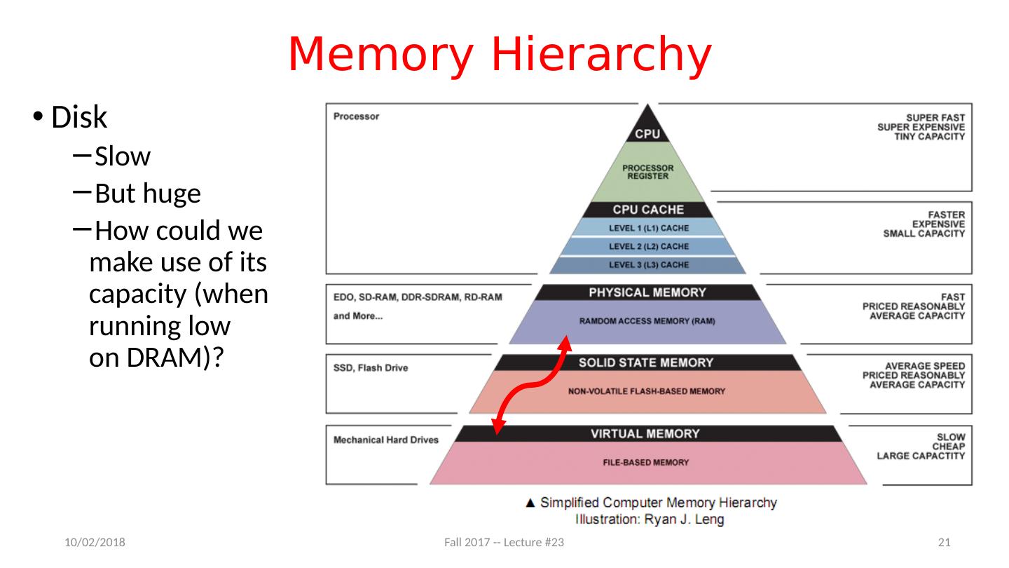 21 .Memory Hierarchy Disk Slow But huge How could we make use of its capacity (when running low on DRAM)? 21 Fall 2017 -- Lecture #23 11/15/17